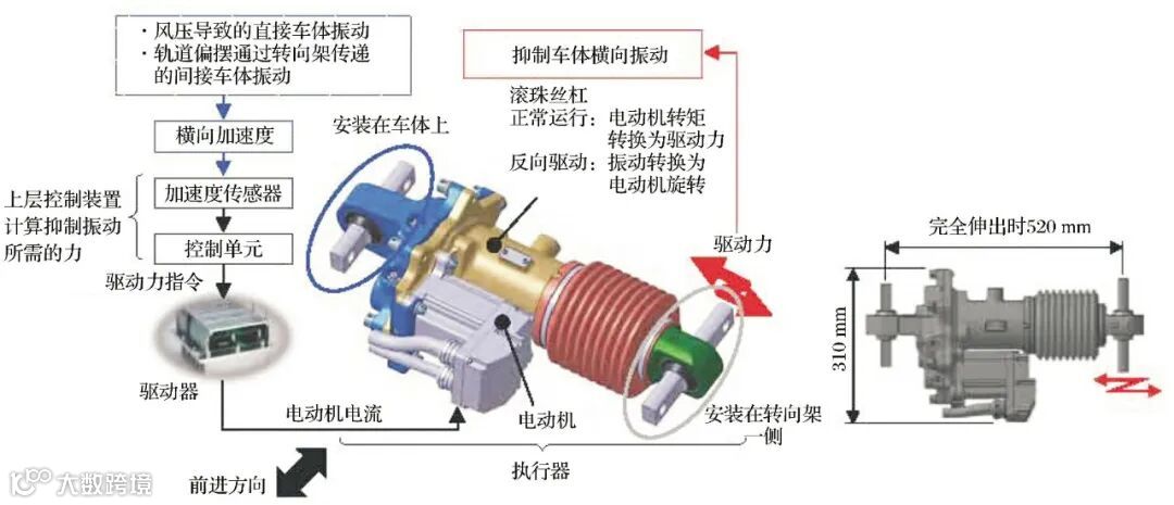 该执行器安装在转向架与车体之间,与图7所示的横向移动阻尼器平行,响应上层控制装置的指令,在横向上产生驱动力。作为一种将电动机的旋转运动转换为输出轴直线运动的机构,一种高效率、低惯量和高反向可驱动性的精密滚珠丝杠已被采用。驱动力的高效传递降低了对电动机的转矩需求,这使执行器的结构更紧凑且更节能。除了滚珠丝杠的反向可驱动性,电动机结构紧凑、惯量低,从而改善了系统响应,抑制了系统振动。