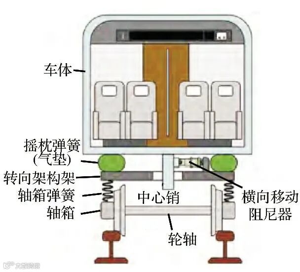 铁路车辆需要满足可靠性和安全性的技术要求。针对豪华列车,还需要提供高舒适性。此外,抑制车辆振动作为保证舒适性的问题已得到突出关注。车辆振动源于多种原因,包括轨道偏摆、坡度变化、车辆轨迹从转向架间接传递到车体以及周围的气压直接使车体左右晃动。为了抑制车体振动,由轴箱弹簧、摇枕弹簧和横向移动阻尼器组成的被动悬架被安装到铁路车辆上,如图7所示。