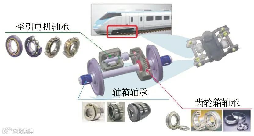 用在车辆轮轴附近的轴承(图1)分为3类:轴箱轴承、齿轮箱轴承和牵引电机轴承。
