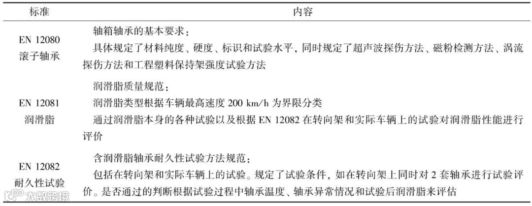 按照欧洲高速铁路网互联互通法令,在欧洲已建立铁路车辆轴箱轴承标准,如EN 12080,EN 12081和EN 12082(表1),对轴承技术要求、润滑脂填充以及性能与耐久性评价方法进行了标准化。这能使满足以上标准的轴箱轴承应用于国际铁路车辆,尤其是欧洲范围内的车辆,并保持相应的质量性能水平。关于RAMS(可靠性、可用性、可维护性和安全性)的标准也已建立。为满足全球化的要求,NSK也正基于上述标准开发产品。