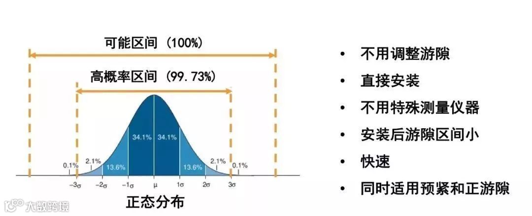 Set-Right使用概率方法并控制相关零件的尺寸公差来确保所有的装配总成中有99.73%的轴承游隙落在可接受的范围内。这是一组随机变量组合后的数学预测,变量就是轴承公差和轴、轴承座等安装组件的公差。