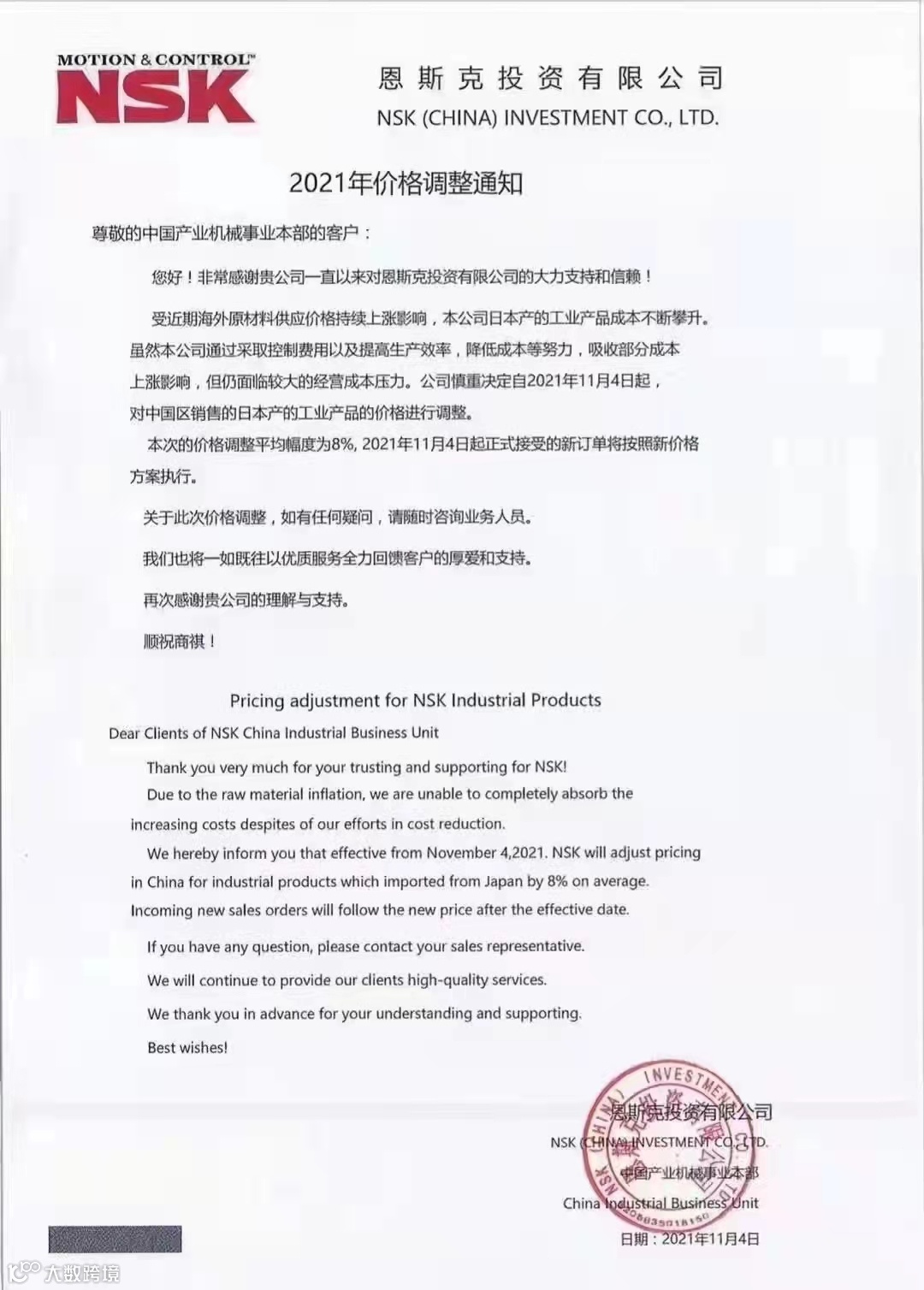 NSK轴承涨价函