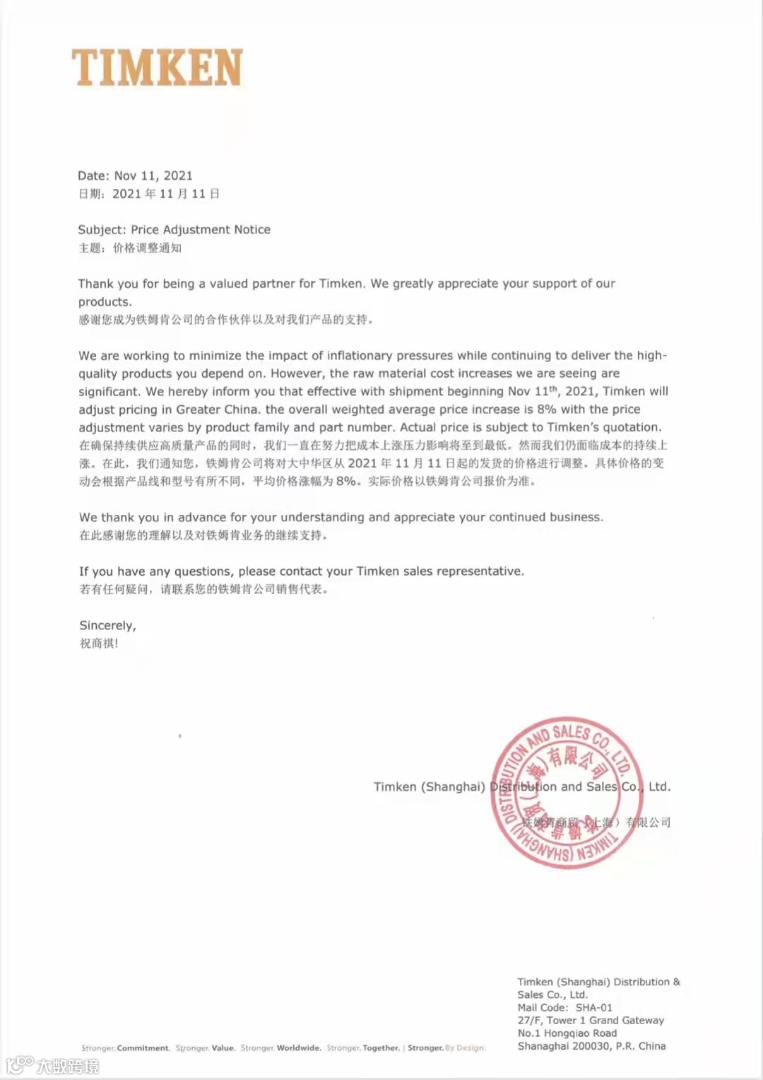 TIMKEN轴承涨价函