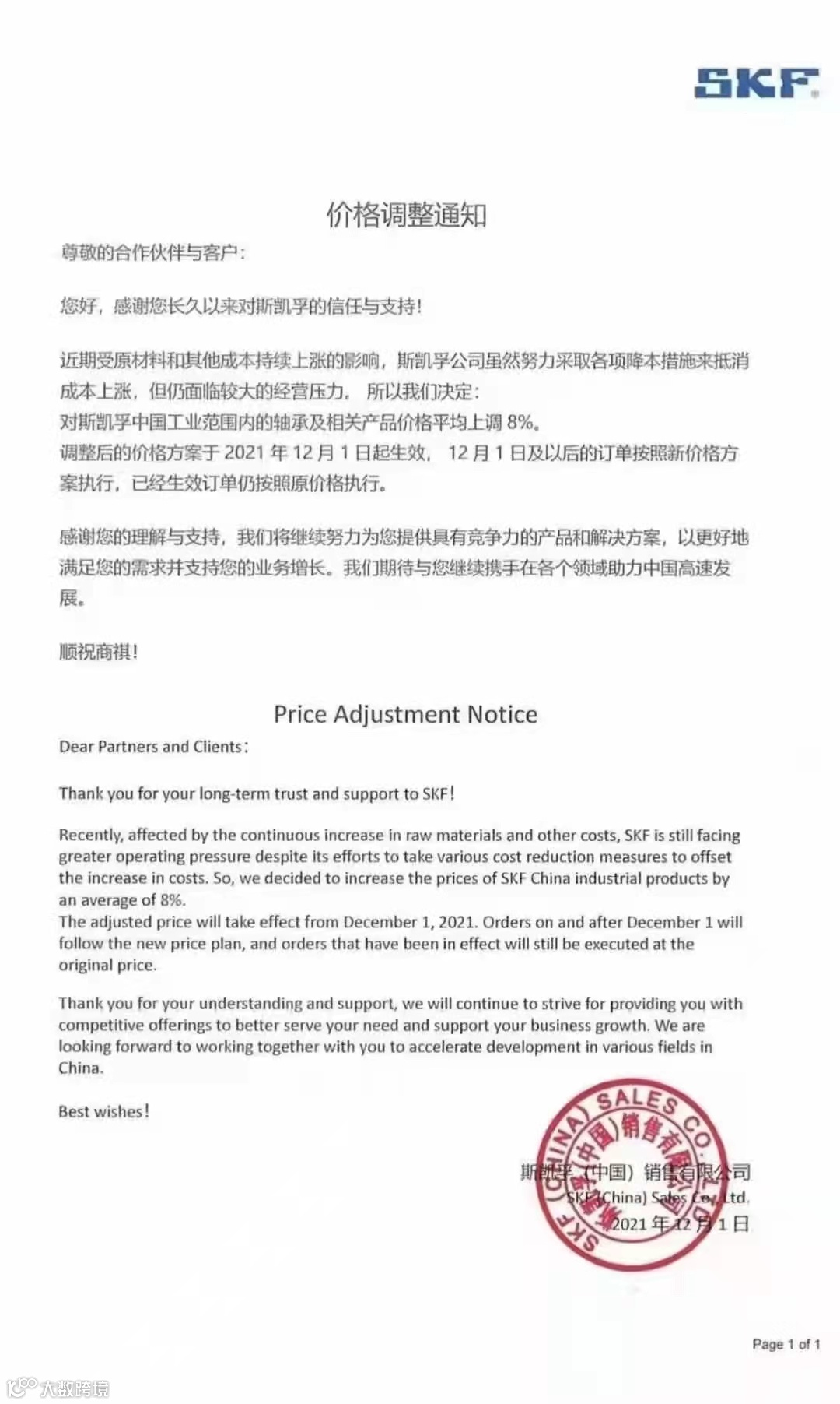SKF轴承涨价函