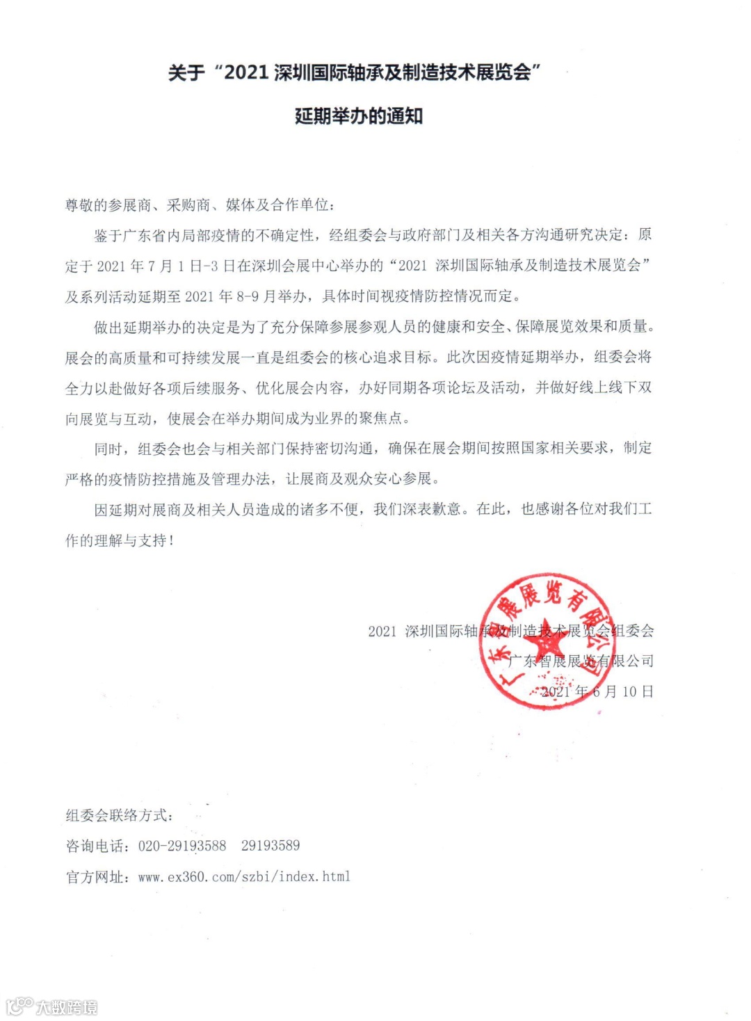 鉴于广东省内局部疫情的不确定性,经组委会与政府部门及相关各方沟通研究决定:原定于2021年7月1日-3日在深圳会展中心举办的“2021 深圳国际轴承及制造技术展览会”及系列活动延期至2021年8-9月举办,具体时间视疫情防控情况而定。