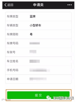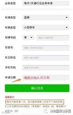 3.根据要求填写车辆信息→【确认信息】(注意:申请日期应填写计划来深日期,每月只能申请一次,且仅能申请第二日及下个月的日期)