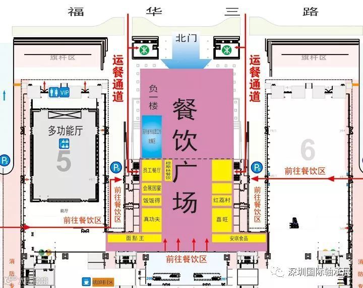 深圳会展中心就餐区需要从二楼下电梯到一楼,就餐区位于北正面一楼。展馆餐饮区请参见下图,请需要就餐的人员到指定餐饮区就餐。