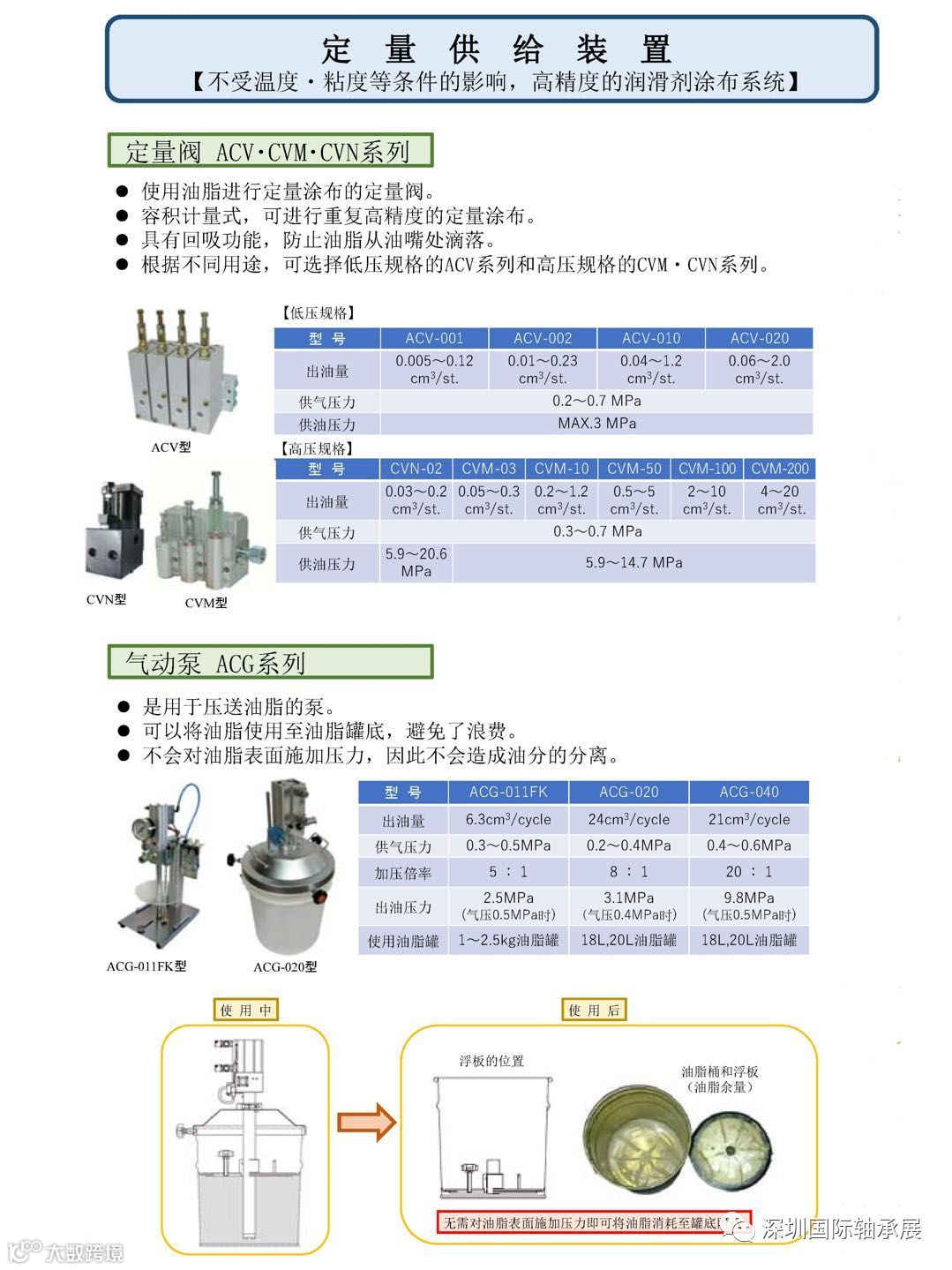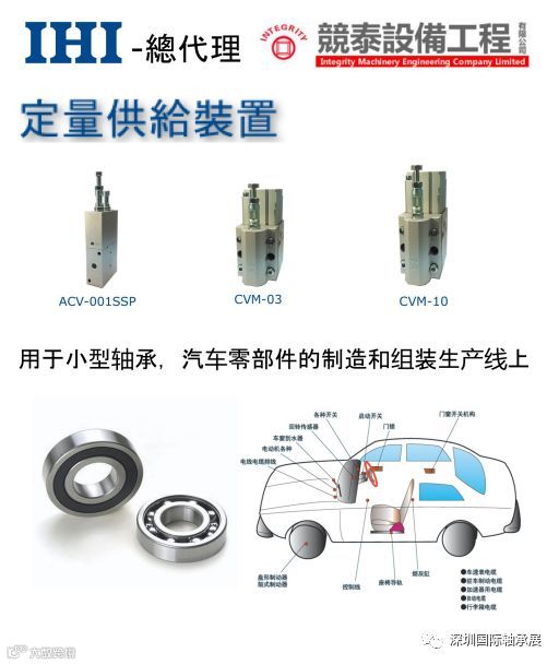 1、廣泛適用於軸承自動化生產線及汽車零部件自動化生產線的高效,精准,精密之加脂設備,日本IHI定量閥型號(CVM-03/10/50及ACV-001/002/010/020等全系列精密定量閥),IHI定量閥注脂量範圍在0.005-20g。並提供專用氣動注脂泵ACG-010K,ACG-020 &ACG-040。