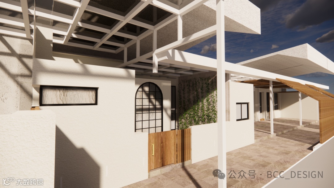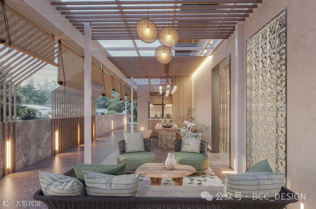 门前庭院灯光氛围感很重要,柔和的氛围庭院灯光让整个空间更具有舒适感,软装青草绿的点缀与大自然融合,原木条造型即做了装饰也是白天遮阳的一道风景线。