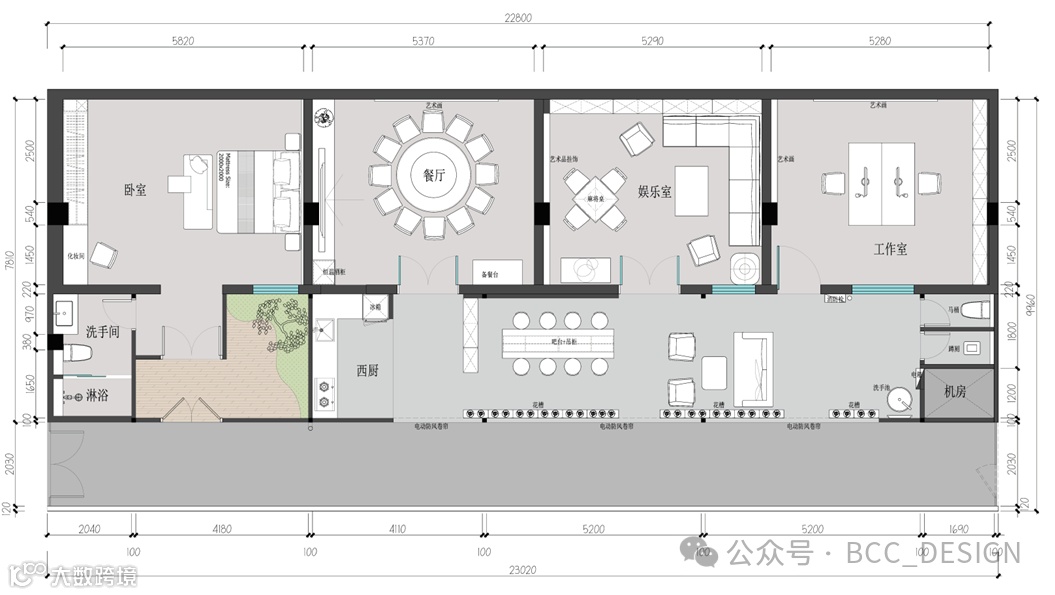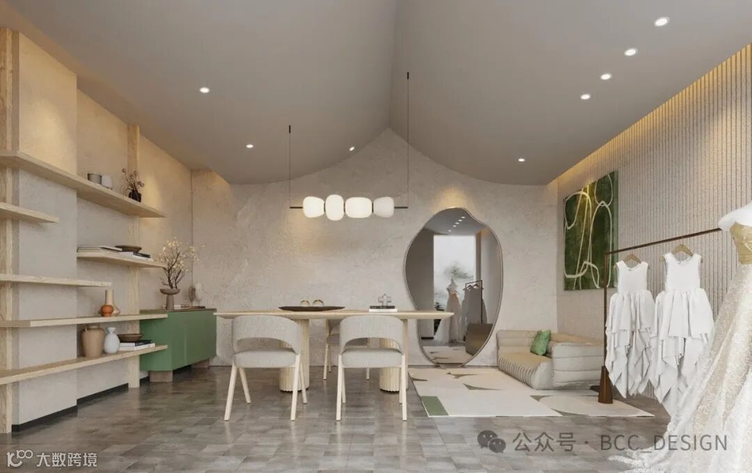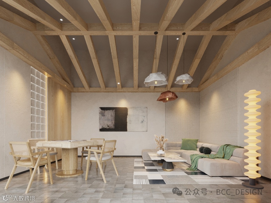 本案设计运用了现代手法的原木结合现有环境的自然风景营造出一个休闲惬意的场所;优雅沉静的空间是女性气质的代言,恰恰也是设计想融入空间的情感表达。