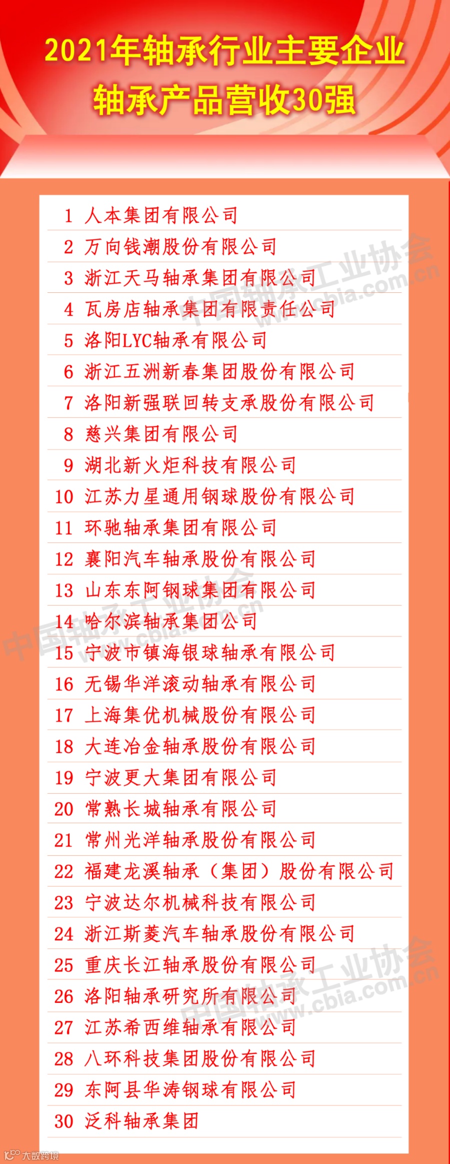 2021年轴承行业主要企业轴承产品营收30强
