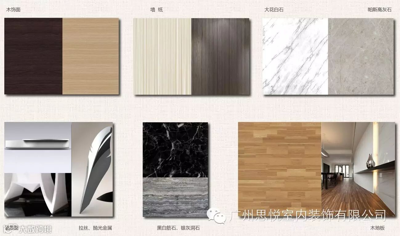 主材:木饰面、墙纸、大花白石、帕斯高灰石、瓷质面、拉丝、抛光金属、黑白筋石头、银灰洞石、木地板。