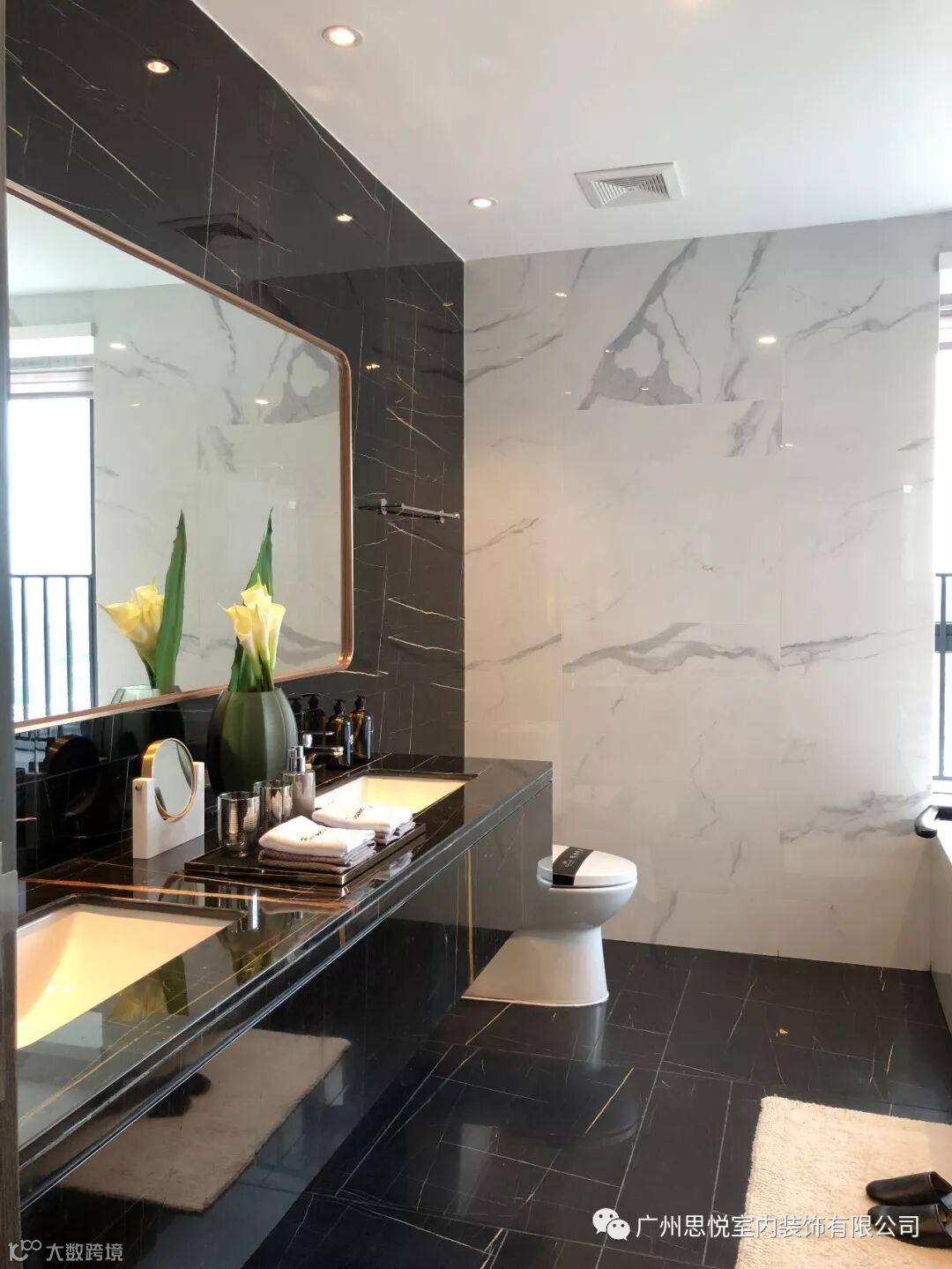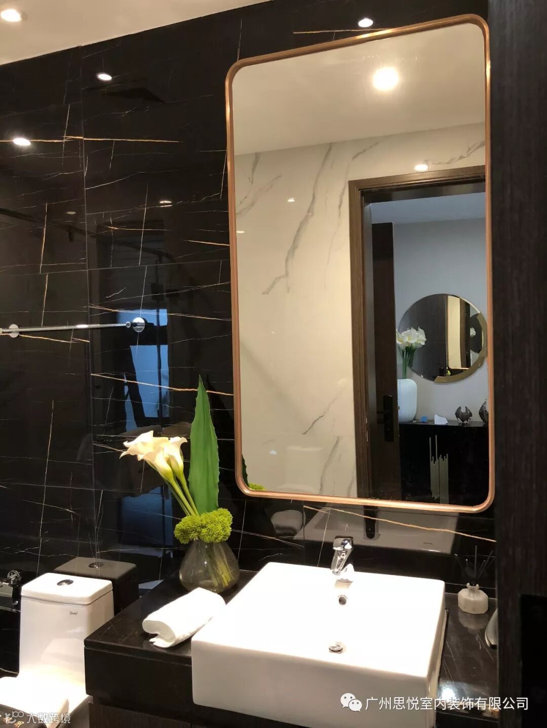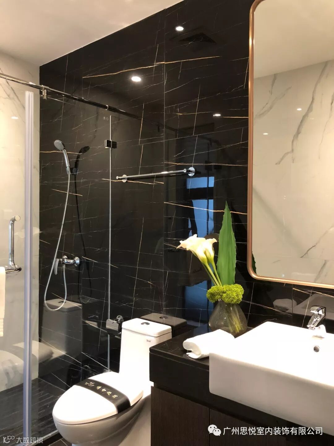 玄关右侧是公共卫生间,色彩搭配上运用黑 白 金三色来呈现格调感