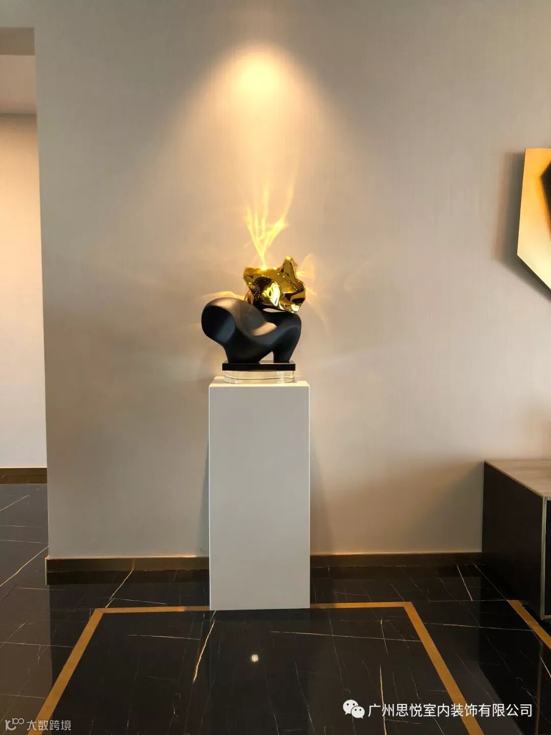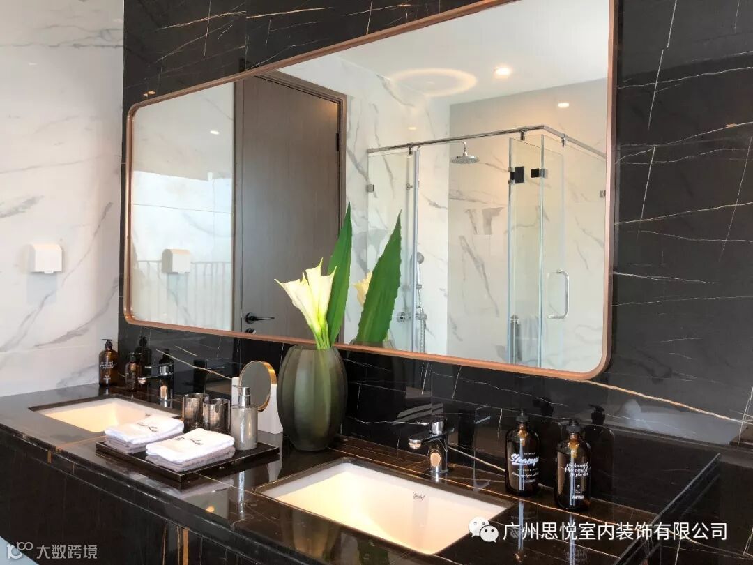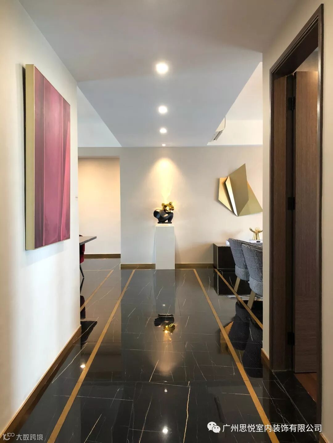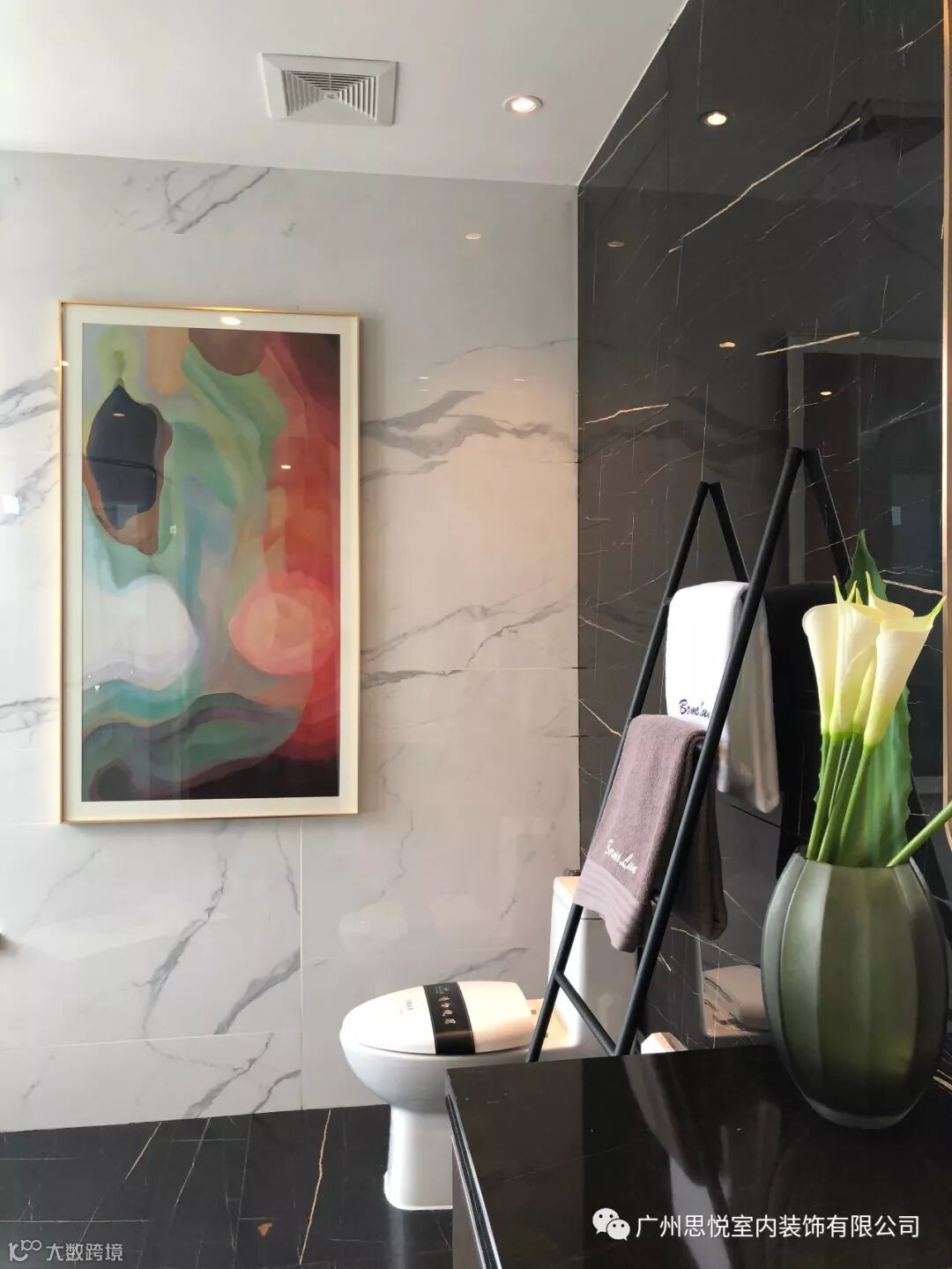 玄关右侧是公共卫生间,色彩搭配上运用黑 白 金三色来呈现格调感