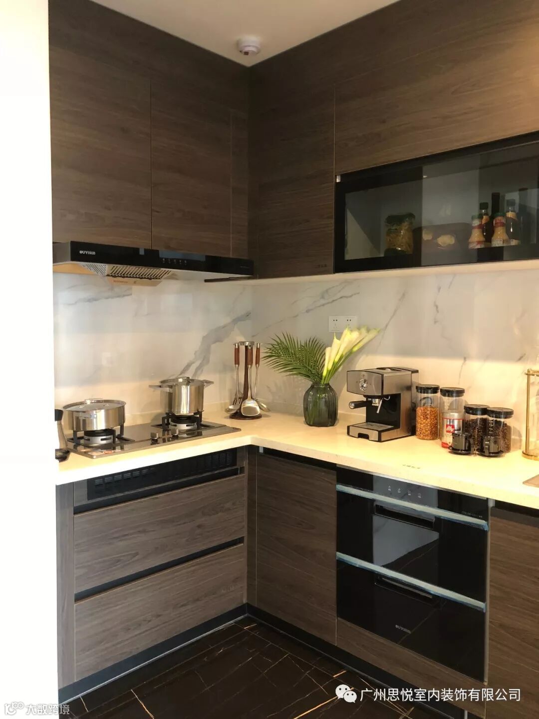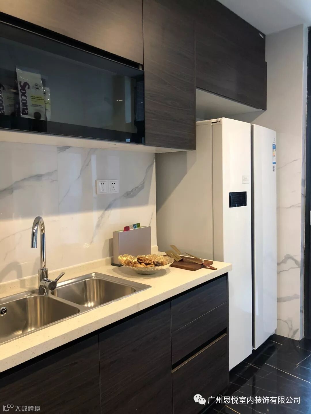 白色墙身与黑色地面形成强烈的对比,让厨房空间干净利落。