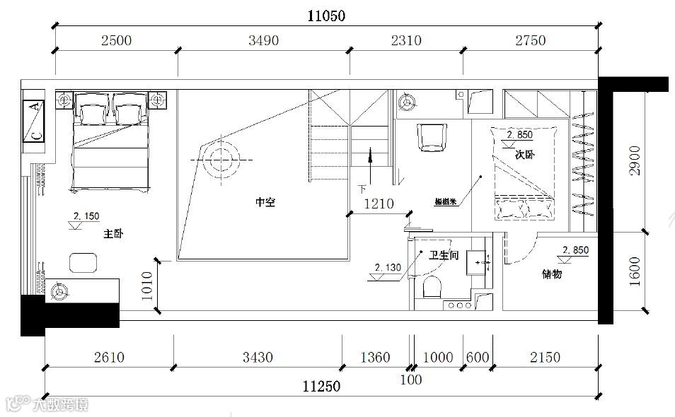 二楼在功能布局上设计师把中空位留在了中间,使两个卧室既都能得到充足的光线,又迎合了现代年轻人对个人私密空间的向往,楼上楼下,一动一静,自由而互不干扰。