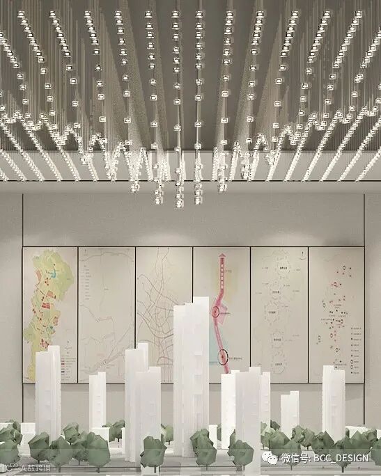 天花的的异形点状灯也是呼应沙盘自然元素,在造型上结合了山型的弧度进行设计,优雅而具有线条美感。