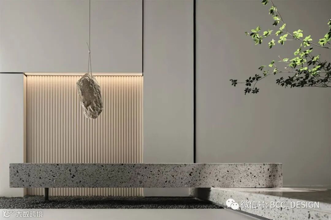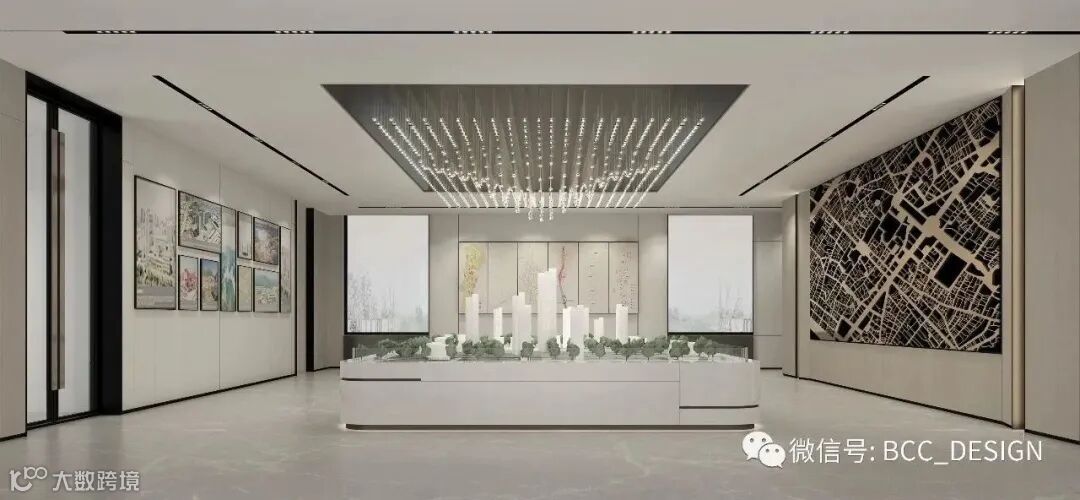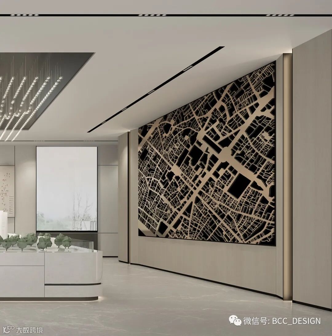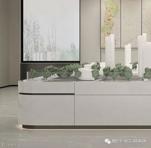中间核心区的沙盘则引入了自然的元素,在材质上选用了带有自然质感的米白洞石搭配黑色不锈钢进行点缀,线型分缝的构成让沙盘造型更为精致。