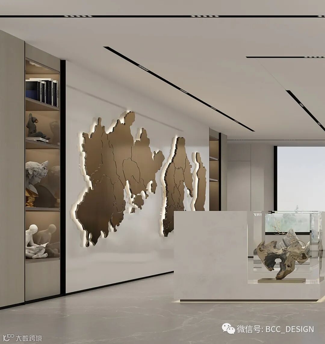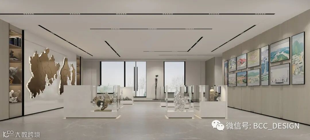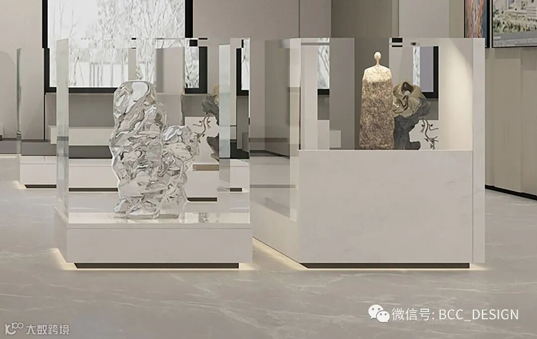 As the lobby deepens into the area, there is a display area showcasing various collections with historical value. The material of the collection cabinet also uses cave stones as the base shape, and the side also uses cave stones to form a natural undulating trend. Paired with high transparency glass, the collection is better displayed.