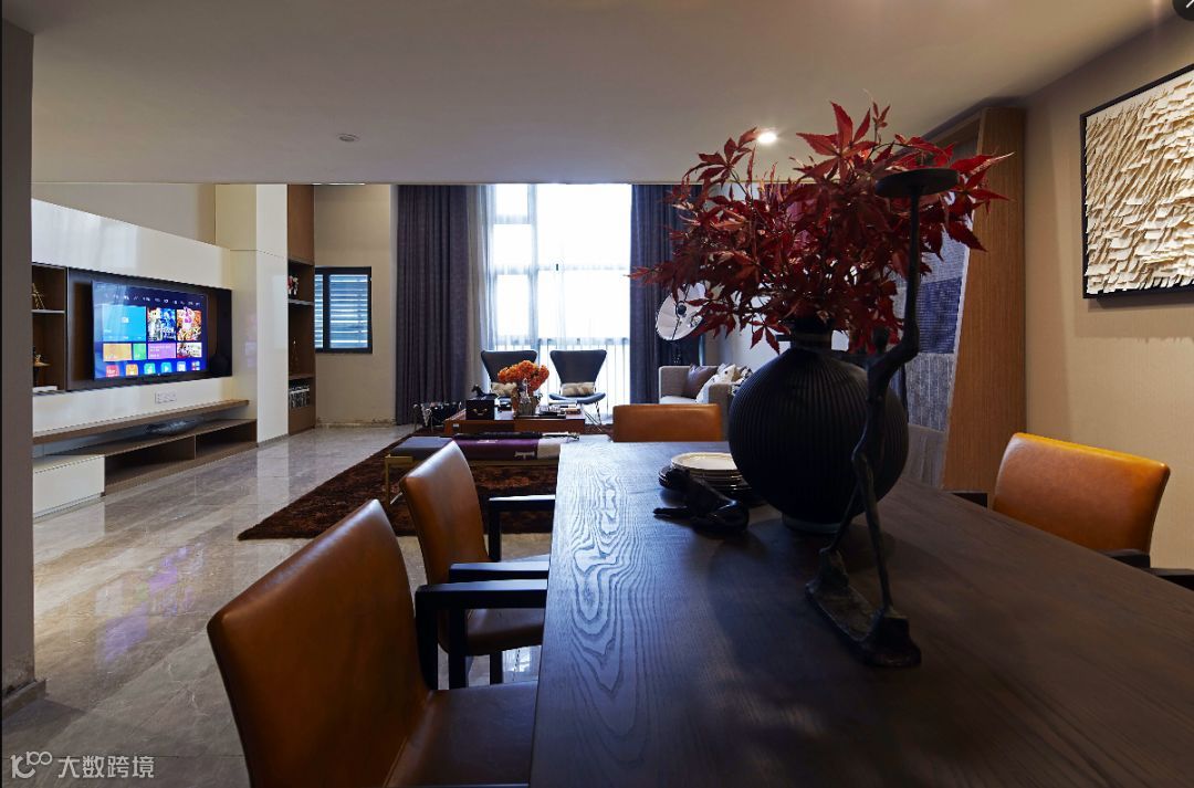 客厅采用纵向格局,磊落翩然,优雅安然的橙色装满了主人对生活满满的爱意,将皮革、布艺、金属等材料巧妙结合,营造出现代轻奢的居住氛围。