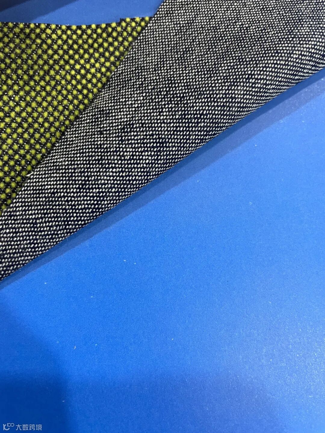 独特的彩点牛仔,表面黑色的斜纹组织中闪烁着彩点。反面则是绚丽的彩色斜纹组织。