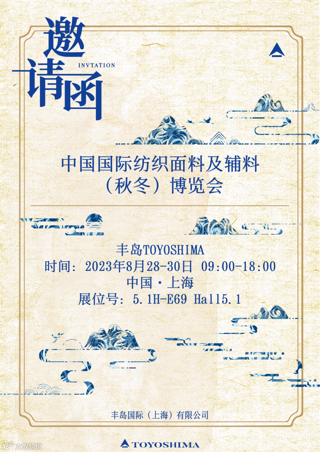 丰岛国际(上海)有限公司将于2023年8月28-30日,参加在国家会展中心举办的2023Intertextile秋冬面辅料展,诚挚邀请全国各界的伙伴们,拨冗参与,莅临现场。