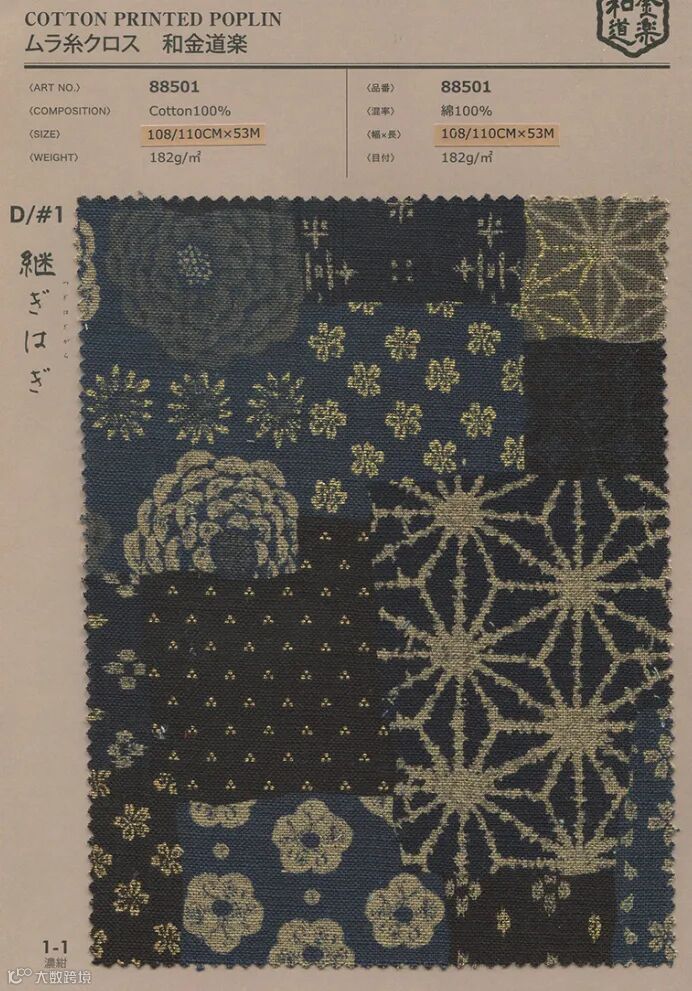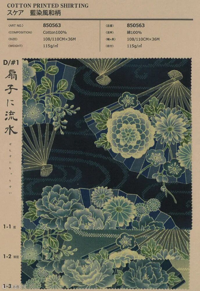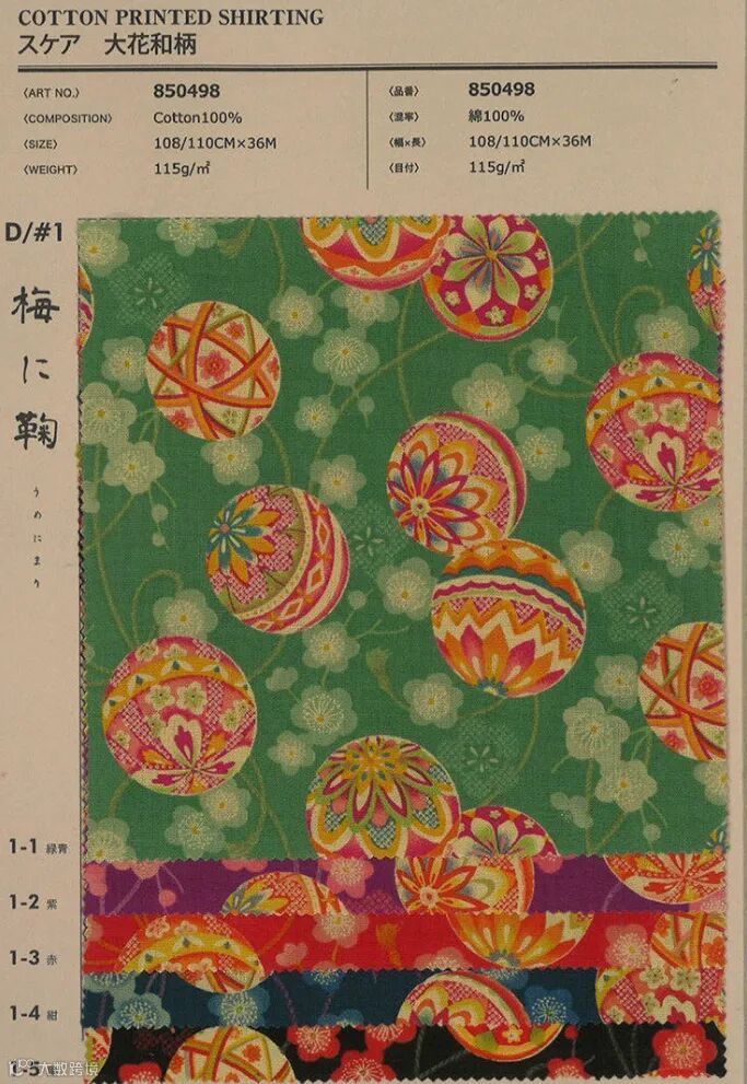 多臂提花面料,以精致的织纹为特色。面料上印有高雅的日式花纹,手感柔软,厚度适中,可广泛用于制作服装、小物件及室内装饰用品等。