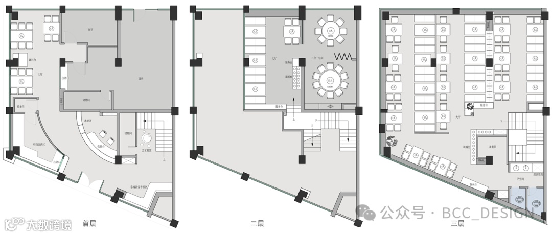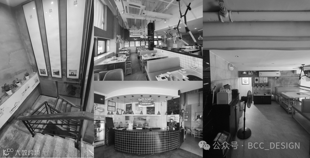 The original walls of the open dining area on the second and third floors have been demolished, creating a visually appealing space. A row of beef making illustrations has been added to the walls, and the ceiling decorations have also been designed with corresponding elements, creating a coordinated effect throughout the entire space.