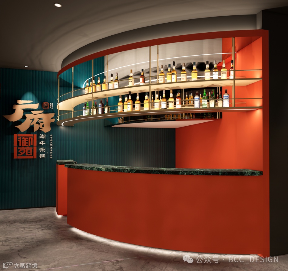 门面设计大胆的采用了大面积的故宫红,巧妙的用牛角元素与广府元素的结合,经典复古绿色的点缀更是视觉的盛宴。