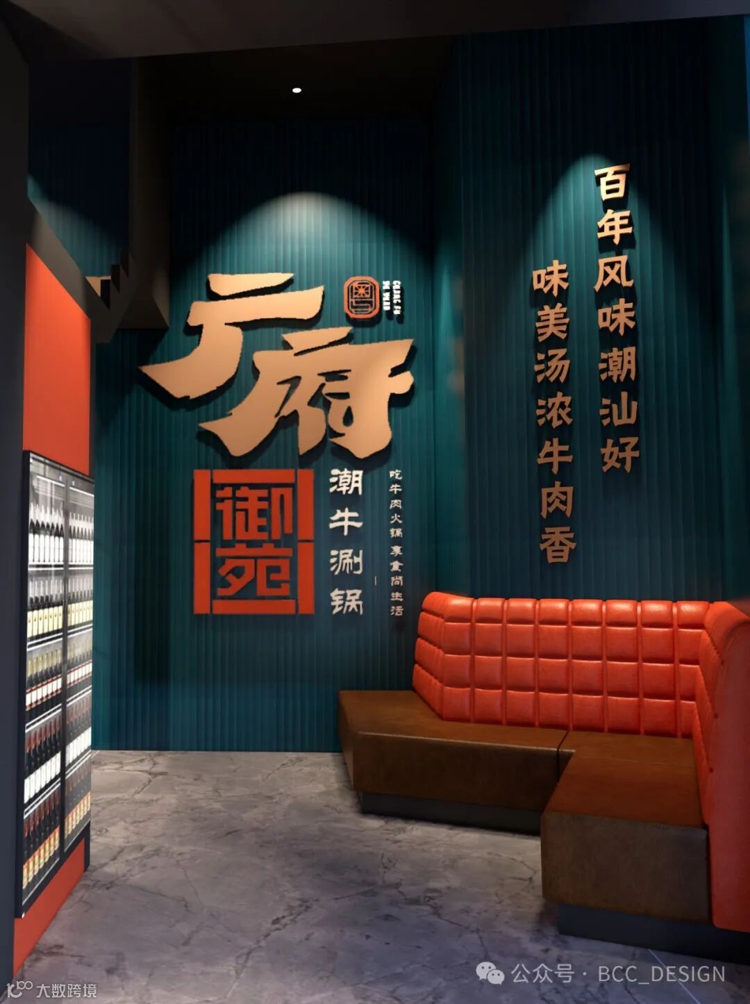 The waiting area at the entry-level corner highlights the brand's positioning, with a focus on Chaoshan beef hotpot, a delicious soup with strong beef aroma, and a century old Chaoshan flavor.