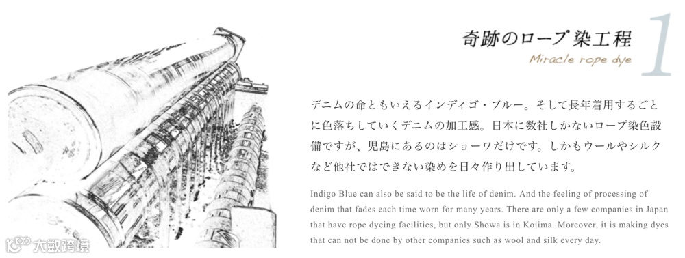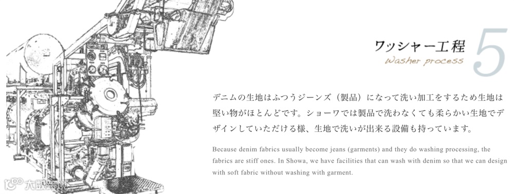 在这样的牛仔产品制作的分工制中,1941年成立的株式会社ショーワSHOWA却拥有纱线的染色和织造连贯生产工艺。SHOWA是唯一一家拥有完整的染色、织造和整理(洗涤)生产线的牛仔布制造商。
