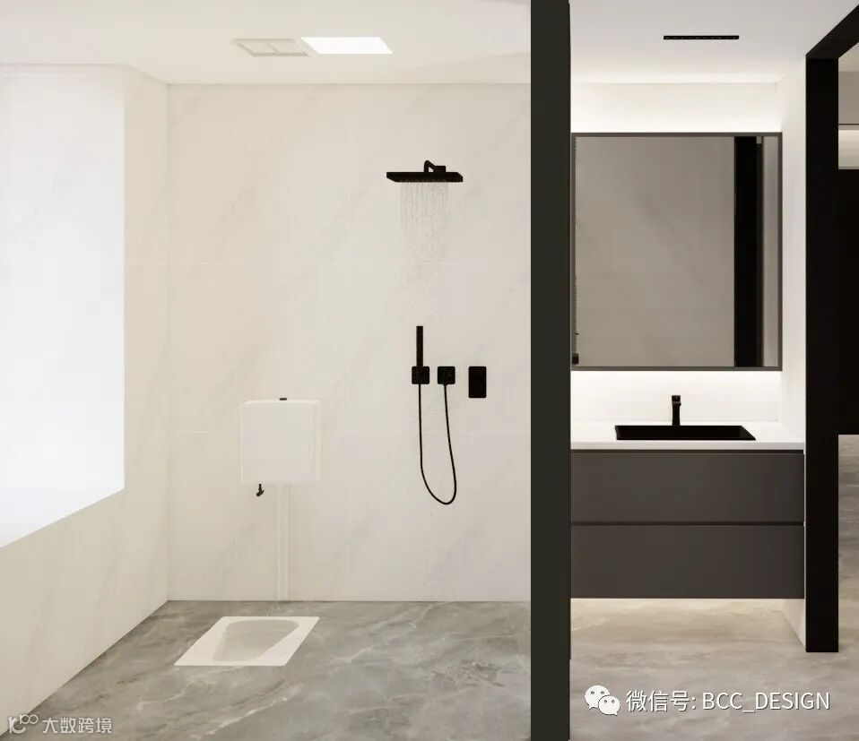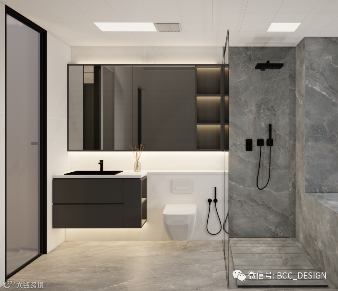 主卫采用深色瓷砖与素色瓷砖形成一个对比搭配,提高设计感,整面的镜柜使用起来也更方便。