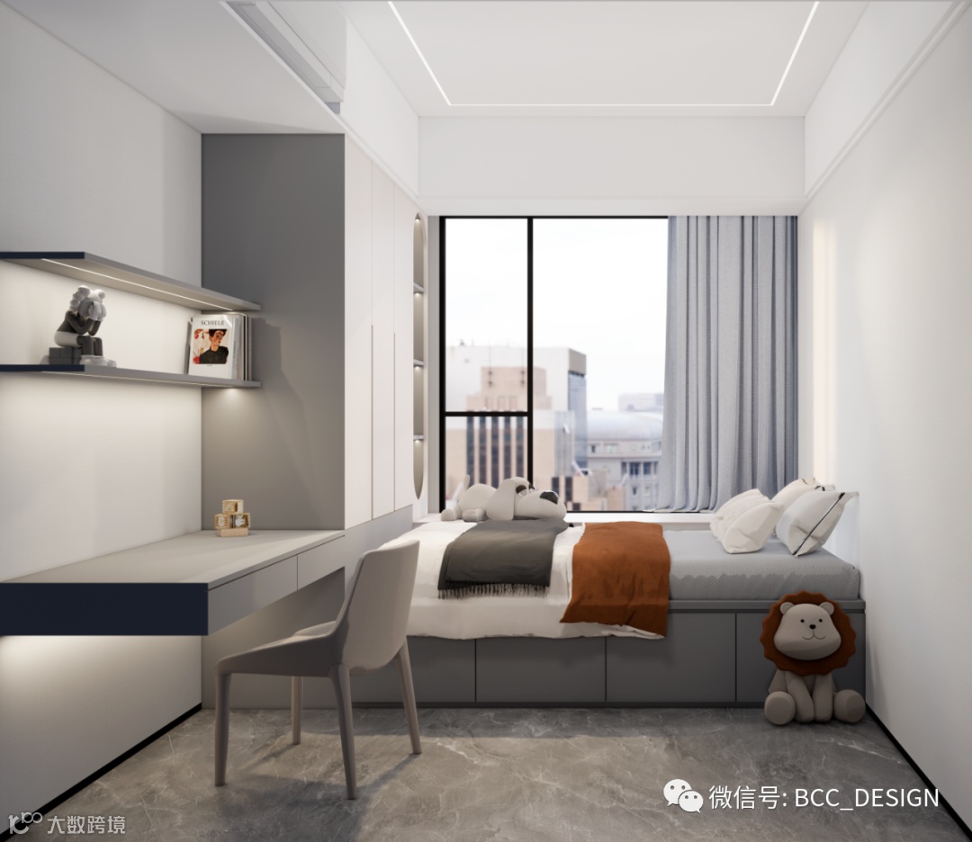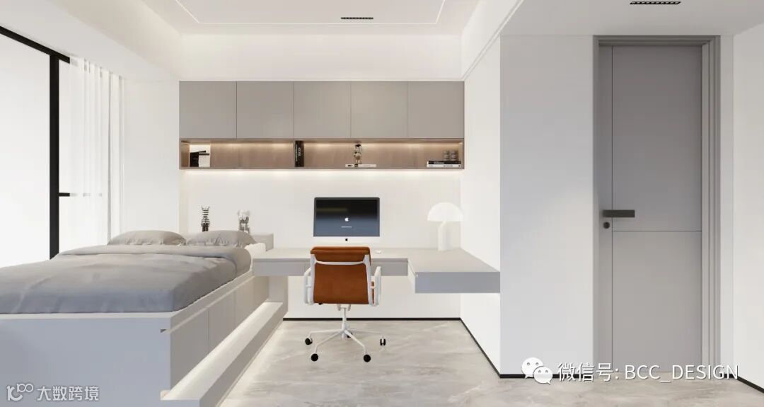The second bedroom wall is mainly white, and the overall texture can be improved through the gray of the cabinet