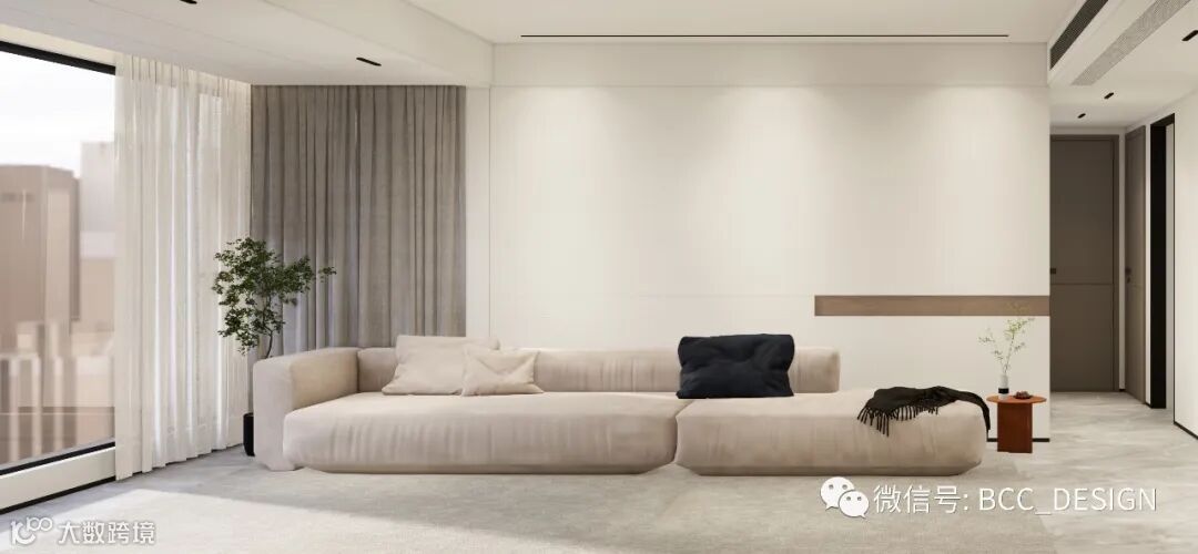 户型拥有独立电梯间,因此在正面设计了一排储物鞋柜方便使用,富有质感的木纹饰面与灰色的柜门相结合,简约大气,在靠窗的位置,充足的自然光为室内造景提供了条件。