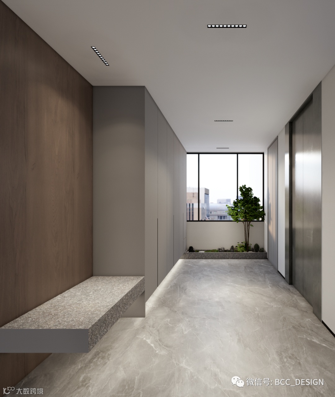 The apartment has an independent elevator room, so a row of storage cabinets are designed in the front for easy use. The rich texture of wood decoration is combined with the gray cabinet door, which is simple and atmospheric. In the position near the window, sufficient natural light provides conditions for indoor landscaping.