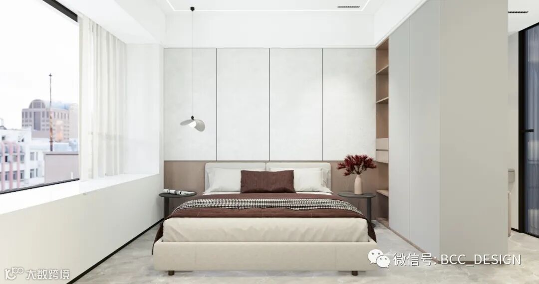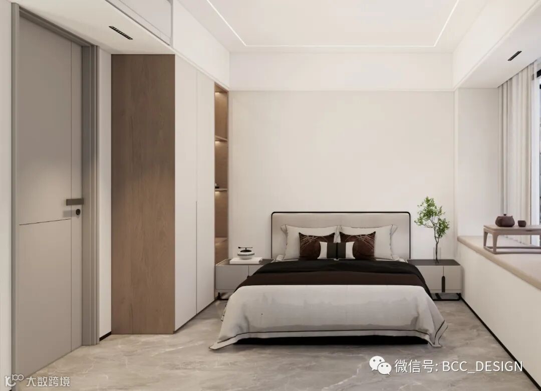 长辈房考虑到使用人群,适当的增加木饰面可以营造到新中式的感觉,与现代的白色相结合使空间明亮。