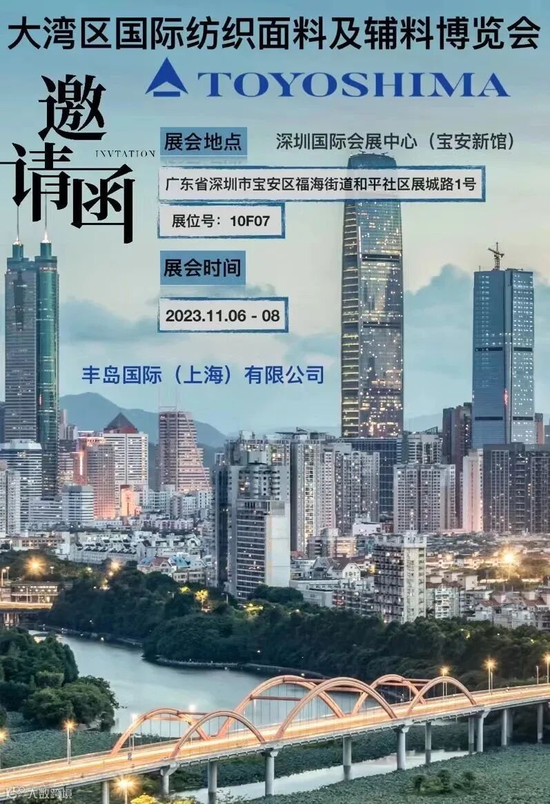 丰岛国际(上海)有限公司将于2023年11月06-08日,参加在深圳国际会展中心(宝安新馆)举办的大湾区国际纺织面料及辅料展,诚挚邀请全国各界的伙伴们,拨冗参与,莅临现场。