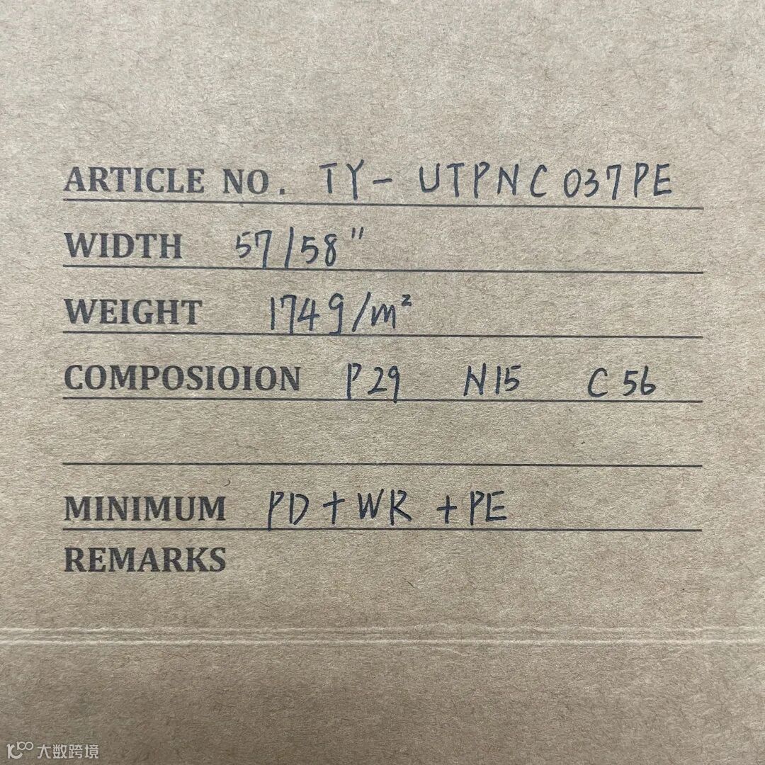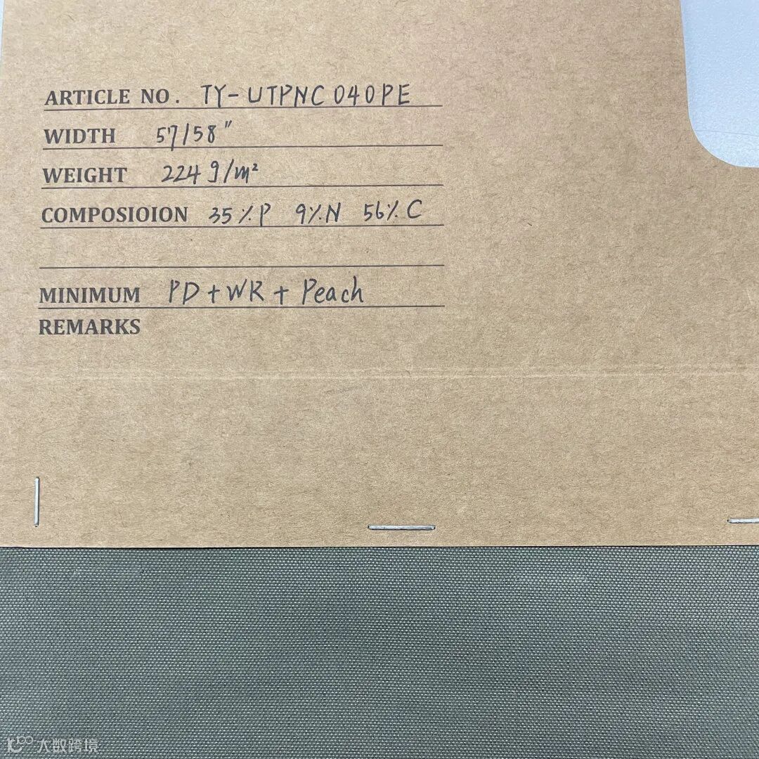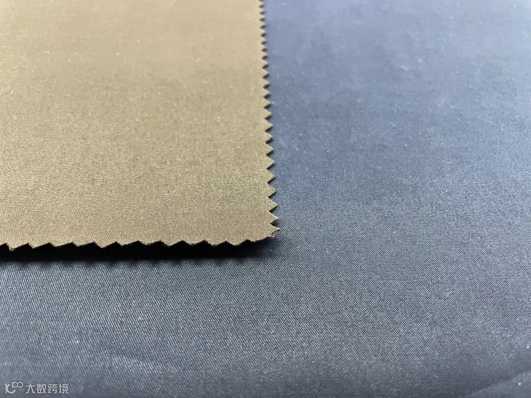 棉涤纶尼龙混纺,具有深蓝色以及橄榄绿二色,细腻的桃绒感,触感柔软,具有防泼水,防水透湿等功能性。