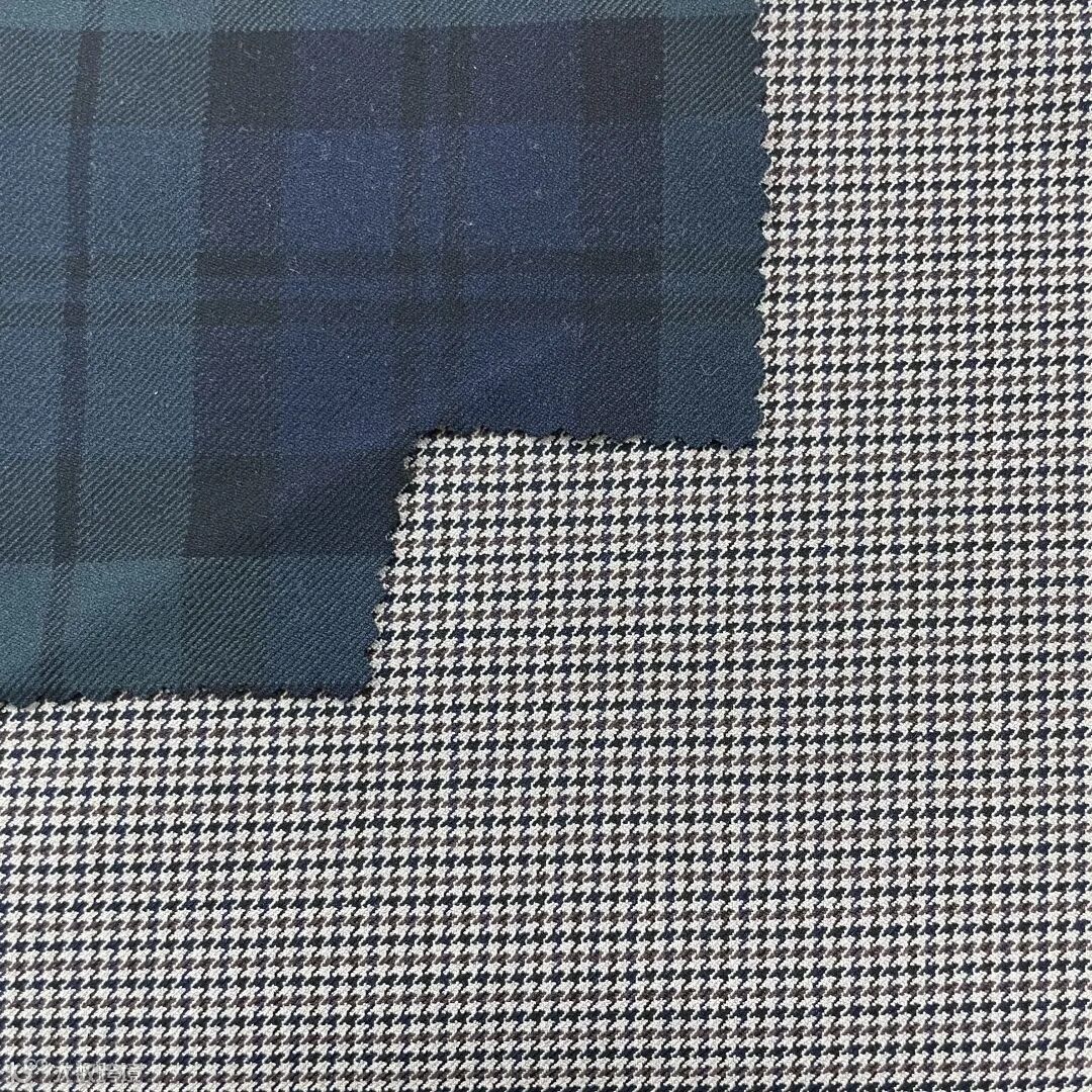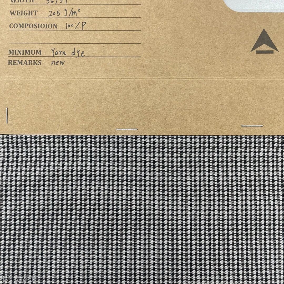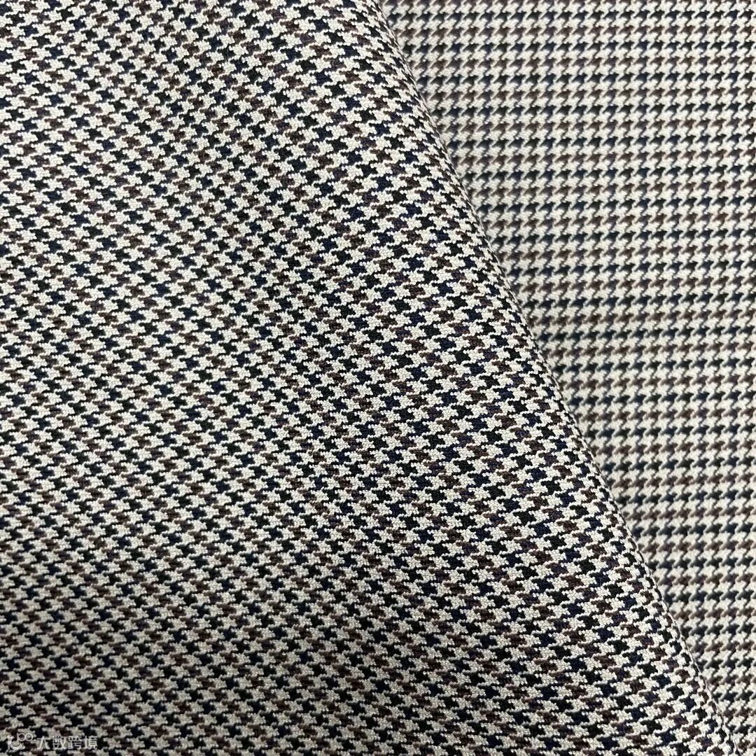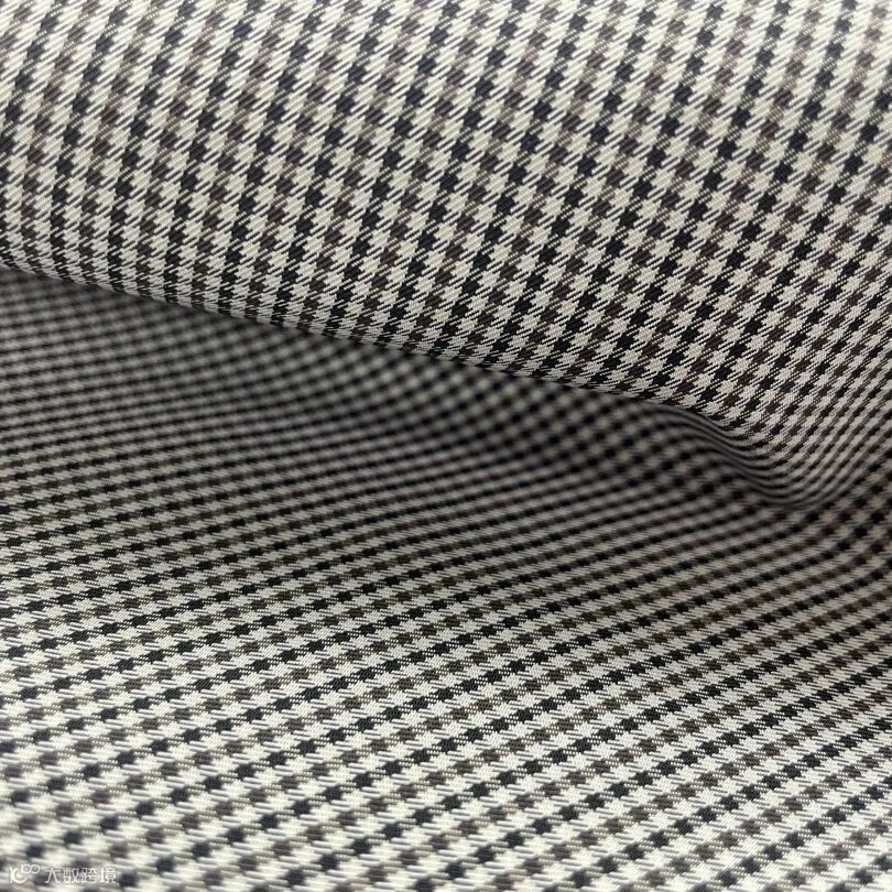 全涤纶的成分,手感硬挺且不易起皱,挺阔塑形,可以用作风衣夹克的制作。千鸟格的印花中,又透露出几分时尚的气息。