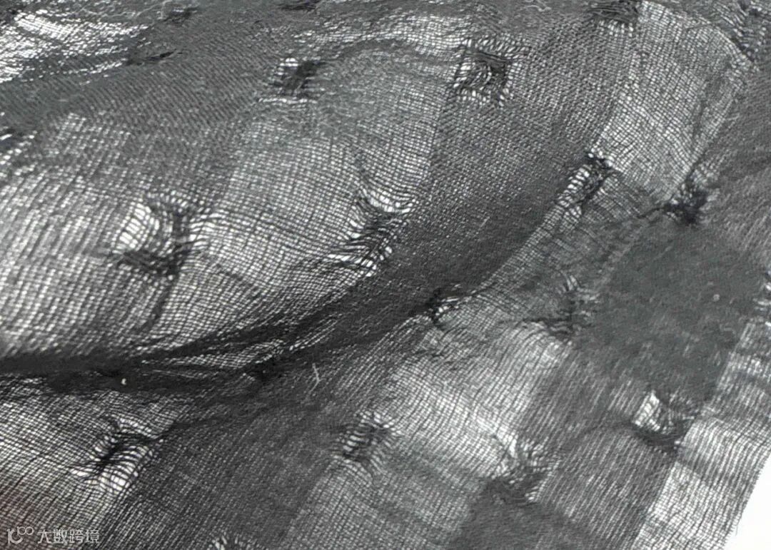 面料背面加工时,将露出的横向纱线成流苏状的设计,呈现出类似拼布的视觉效果。