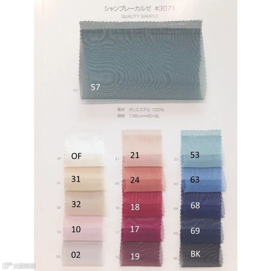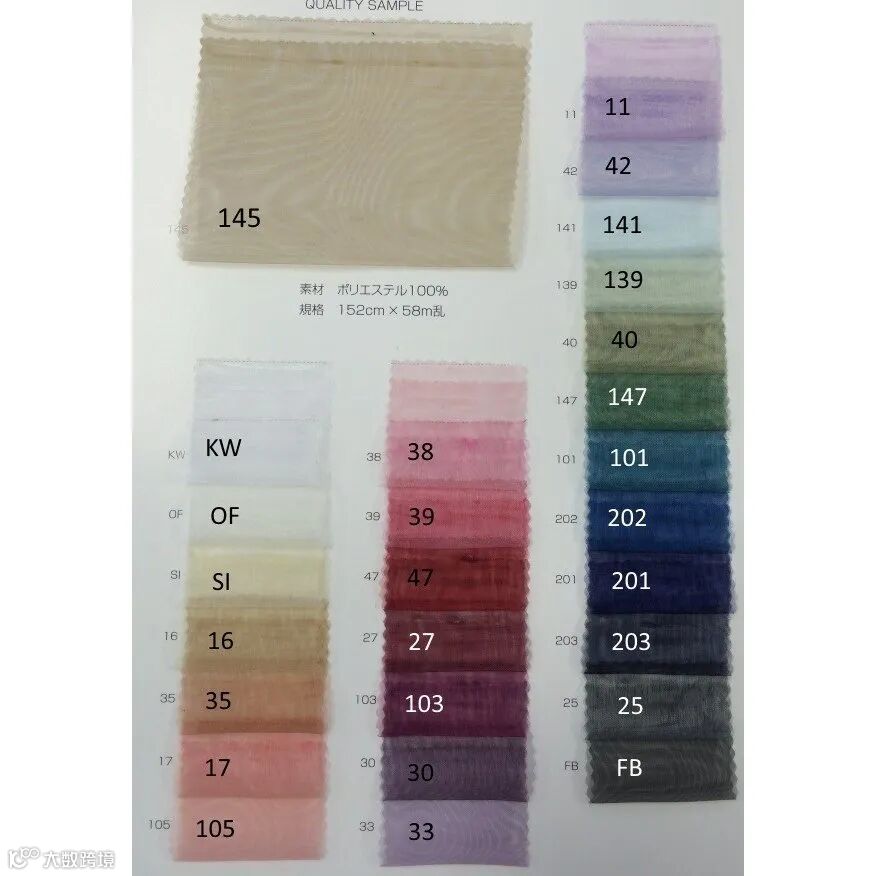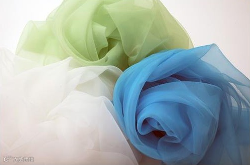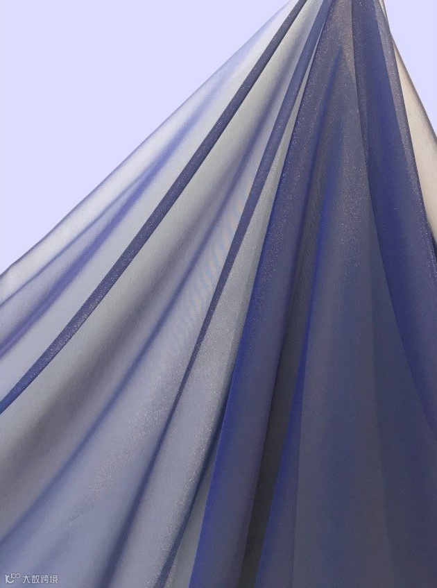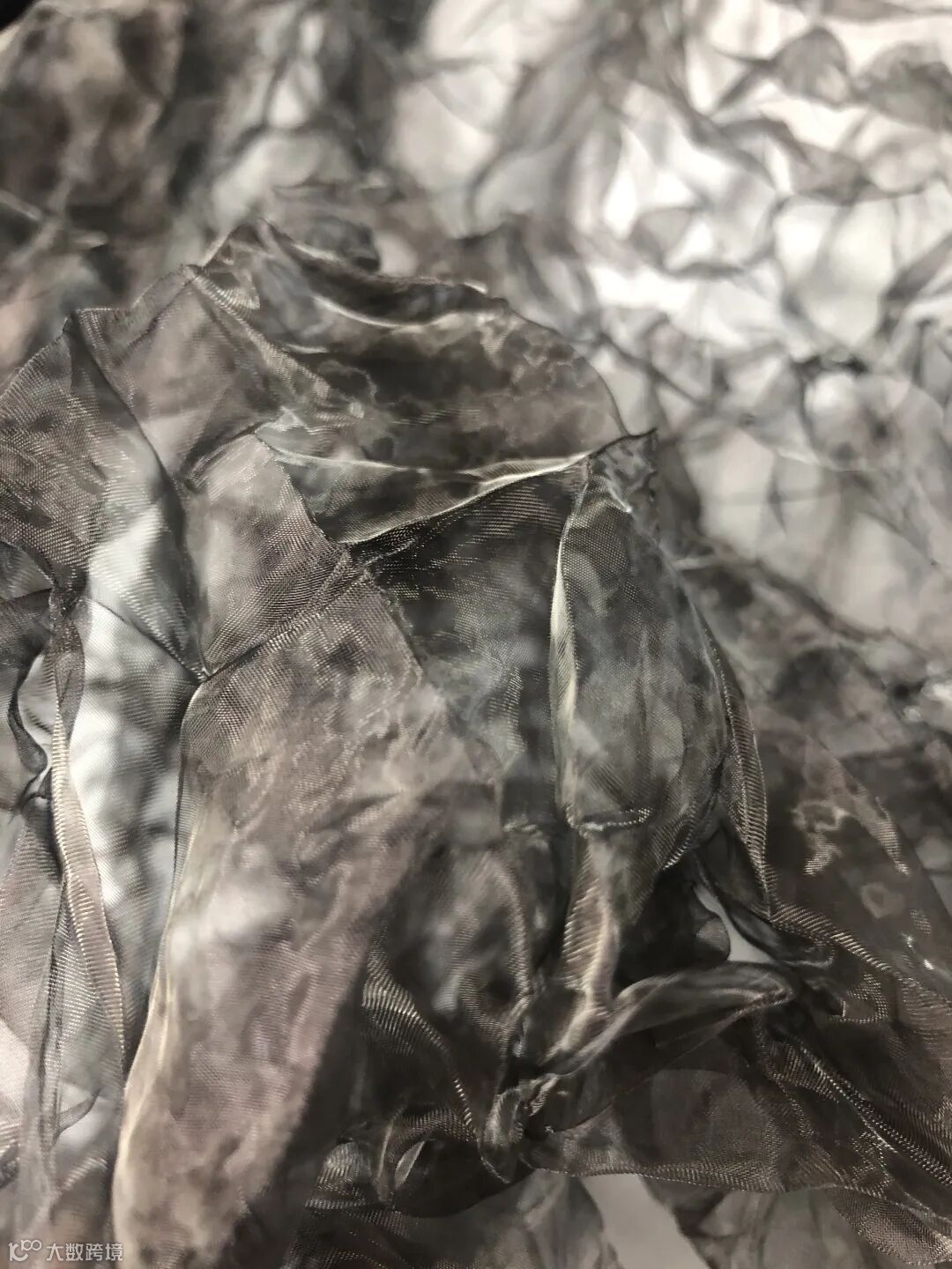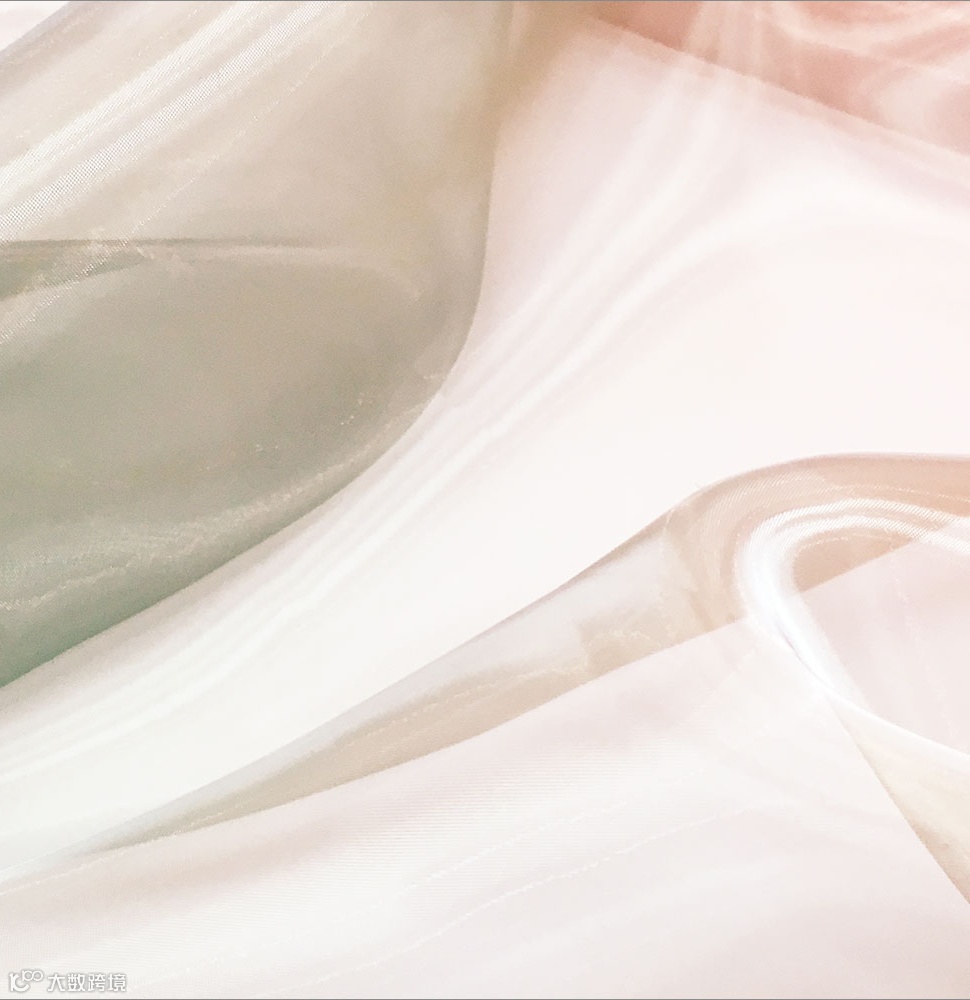 用超细涤纶纱织成,像空气一样轻,实现了丝般顺滑的手感和超薄透明感。普通的欧根纱也是使用极细的涤纶纱,但在这里使用的可以说是不到1/2纱支粗细的超级细涤纶纱。