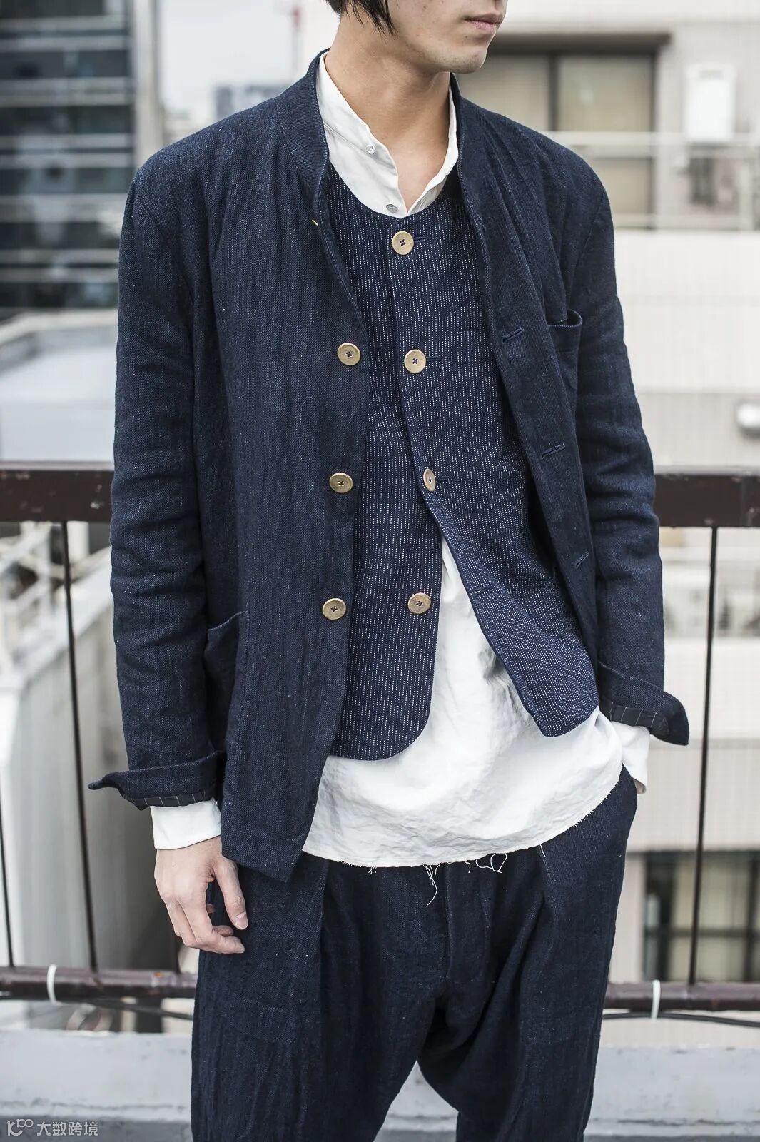 休闲混纺宽条面料,通过宽间距的细条图案排列织法,为经典的条纹元素带来了全新的时尚感受。款式通过宽松廓形,面料的拼接,以及系带等细节来彰显独特的气质