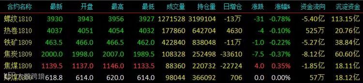 夜盘黑色板块震荡偏弱,螺纹继续回落并伴随大幅减仓,短期行情可能进入调整阶段,重点下方关注3900支撑情况,不跌破涨势犹在,破了就会出现深度调整。收盘螺纹主力收3930跌31;热卷主力收4037跌4;铁矿石主力收463.5跌1;焦炭主力收2000跌7.5;焦煤主力收1139.5涨4;郑煤主力收618.8持平。