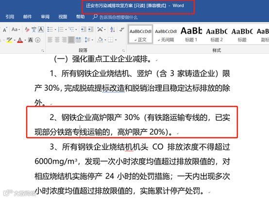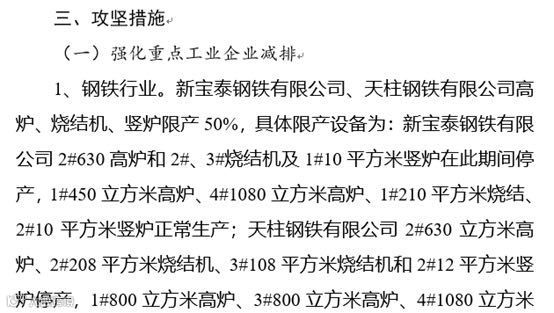 1.烧结、竖炉停限产:6月底前未完成烧结竖炉脱硫、脱硝、脱白深度治理土建量30%的企业,烧结、整炉限产50%;