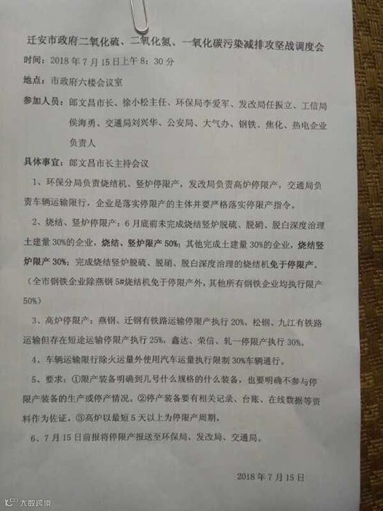 五、7月15日唐山迁安市出台具体限产方案