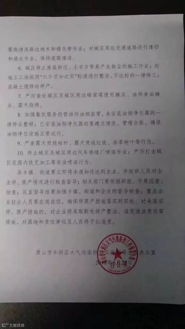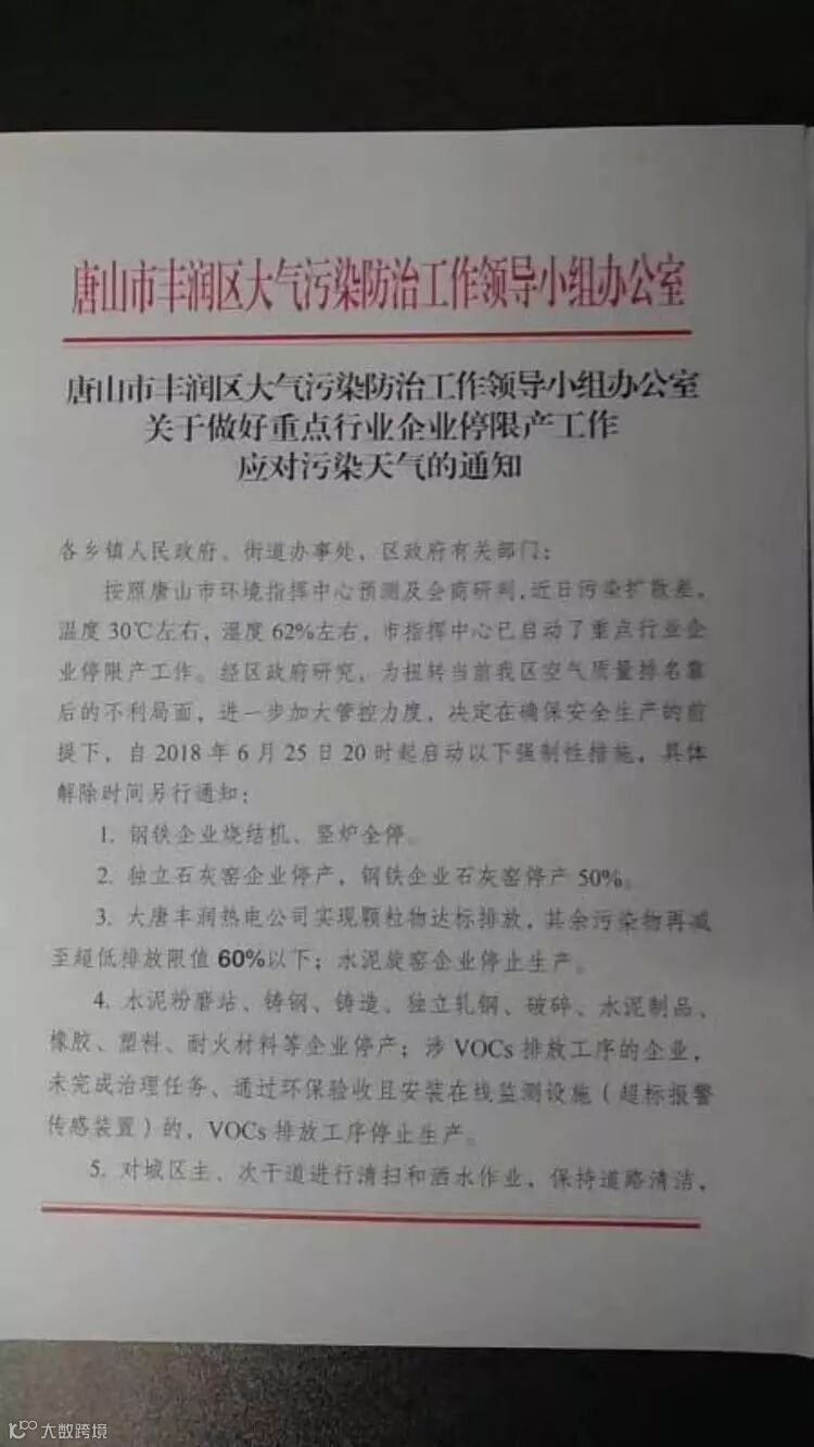 唐山继续限烧结,自2018年6月25日20时起启动以下强制性措施,具体解除时间另行通知: