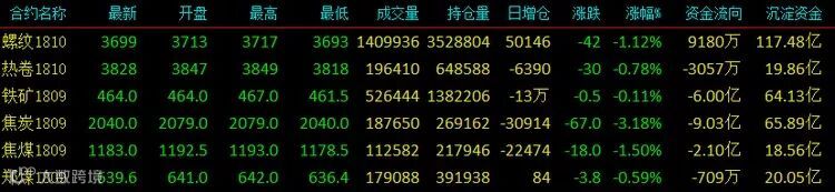 夜盘黑色系延续跌势,焦炭领跌,跌幅超3%;螺纹跌破3700已跌至40日均线支撑,预计短期还将延续偏弱震荡格局。收盘螺纹主力收3699跌42;热卷主力收3828跌30;铁矿石主力收464跌0.5;焦炭主力收2040跌67;焦煤主力收1183跌18;郑煤主力收639.6跌3.8。