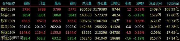 贸易战一触即发,市场屏息静待,夜盘黑色系维持小幅震荡,盘面减仓缩量,资金离场观望为主;今日密切关注中美贸易征税事件发展动态。收盘螺纹主力收3786涨12;热卷主力收3854跌5;铁矿石主力收458.5涨3;焦炭主力收2010持平;焦煤主力收1148涨4.5;郑煤主力收628.4跌7.6。