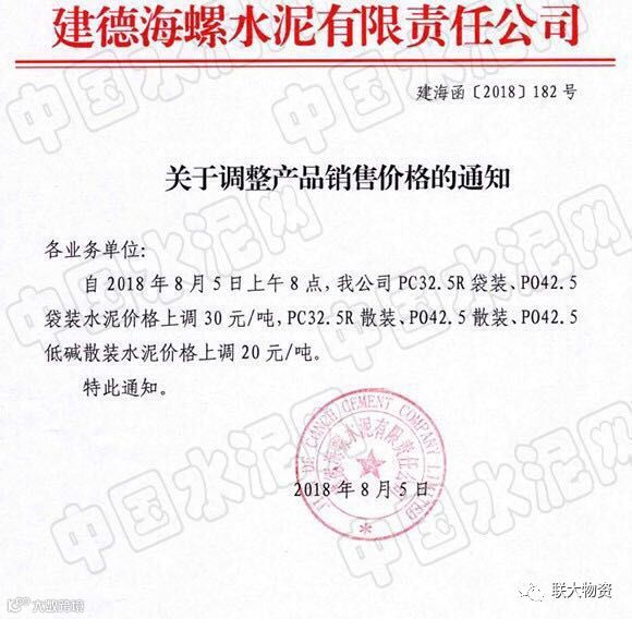 据中国水泥网行情数据中心消息,建德海螺水泥价格率先上调。建德海螺发布的调价通知显示,自2018年8月5日上午8点,建德海螺PC32.5袋装、PO42.5袋装水泥价格上调30元/吨,PC32.5R散装、PO42.5散装、PO42.5低碱散装水泥价格上调20元/吨。