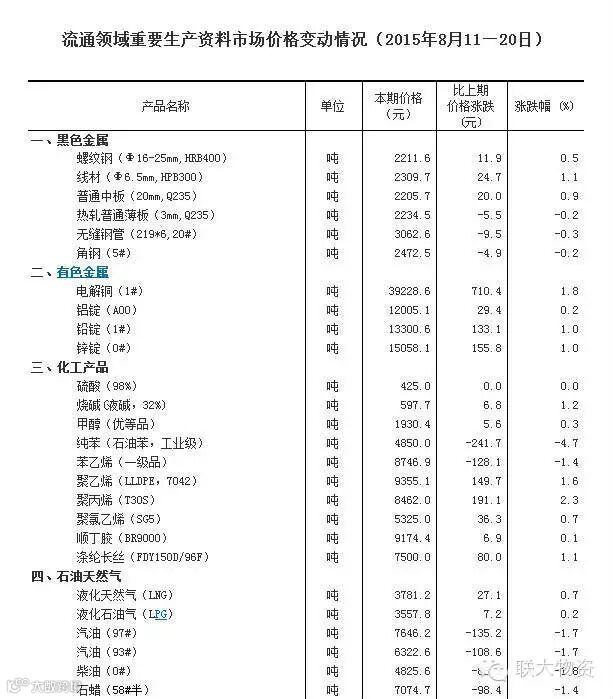 广东联大物资集团2015年8月中旬,据对24个省(区、市)流通领域9大类50种重要生产资料市场价格的监测显示,与8月上旬相比,22种产品价格上涨,22种下降,6种持平。